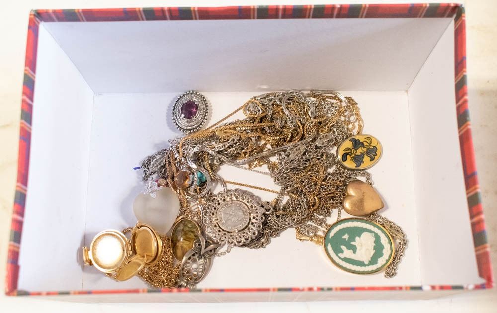 BOX WITH VINTAGE JEWELRY - LOCKETS & MORE