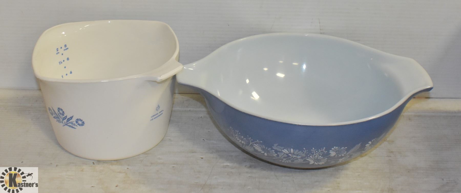 SERVING BOWL - DARK BLUE WITH WHITE FLOWERS, AND VINTAGE CORNINGWARE 2 QT. SAUCE MAKER**ALL ITEMS MUST BE REMOVED BY 5PM MONDAY, OCTOBER 10TH, 2022. ALL REMAINING ITEMS WILL BE SUBJECT TO A $6.00 PER DAY STORAGE CHARGE. ANY ITEMS REMAINING AFTER MONDAY, OCTOBER 24TH, 2022 WILL BE CONSIDERED FORFEITED. NO REFUNDS WILL BE ISSUED FOR FORFEITED ITEMS. TO SCHEDULE A PICK UP APPOINTMENT CLICK HERE
