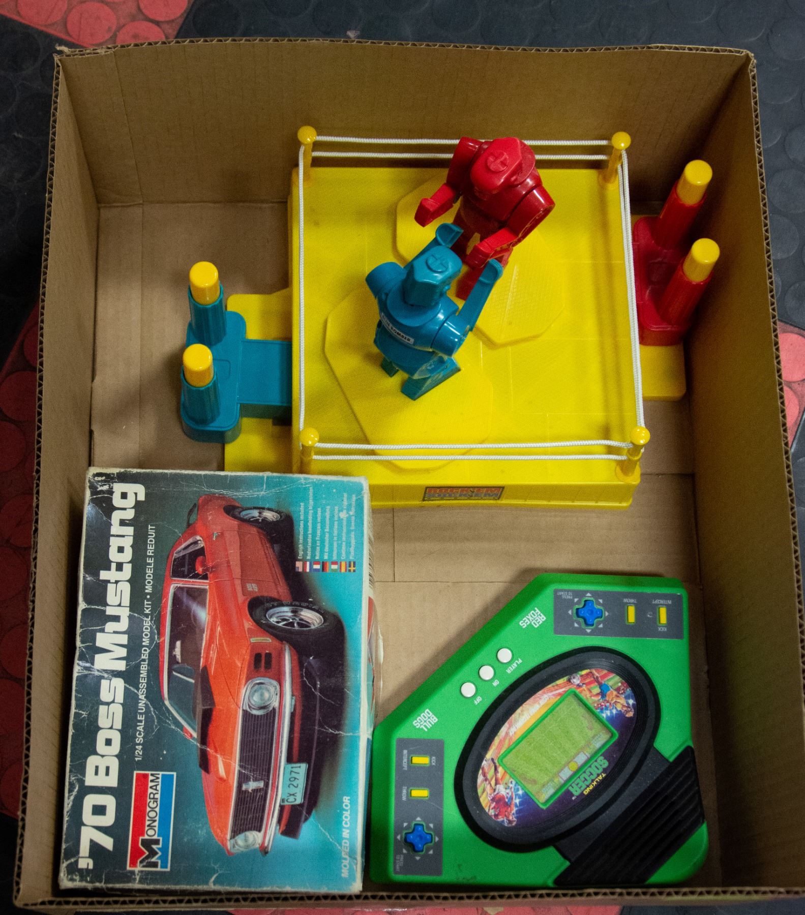 ROCK'EM SOCK'EM ROBOTS, 2-MAN TALKING SOCCER, 1970 BOSS MUSTANG MODEL (PARTIALLY COMPLETE) IN ORIGINAL BOX