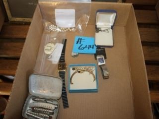 BOX WITH WATCHES, METAL HAIR CURLERS, NECKLACES
