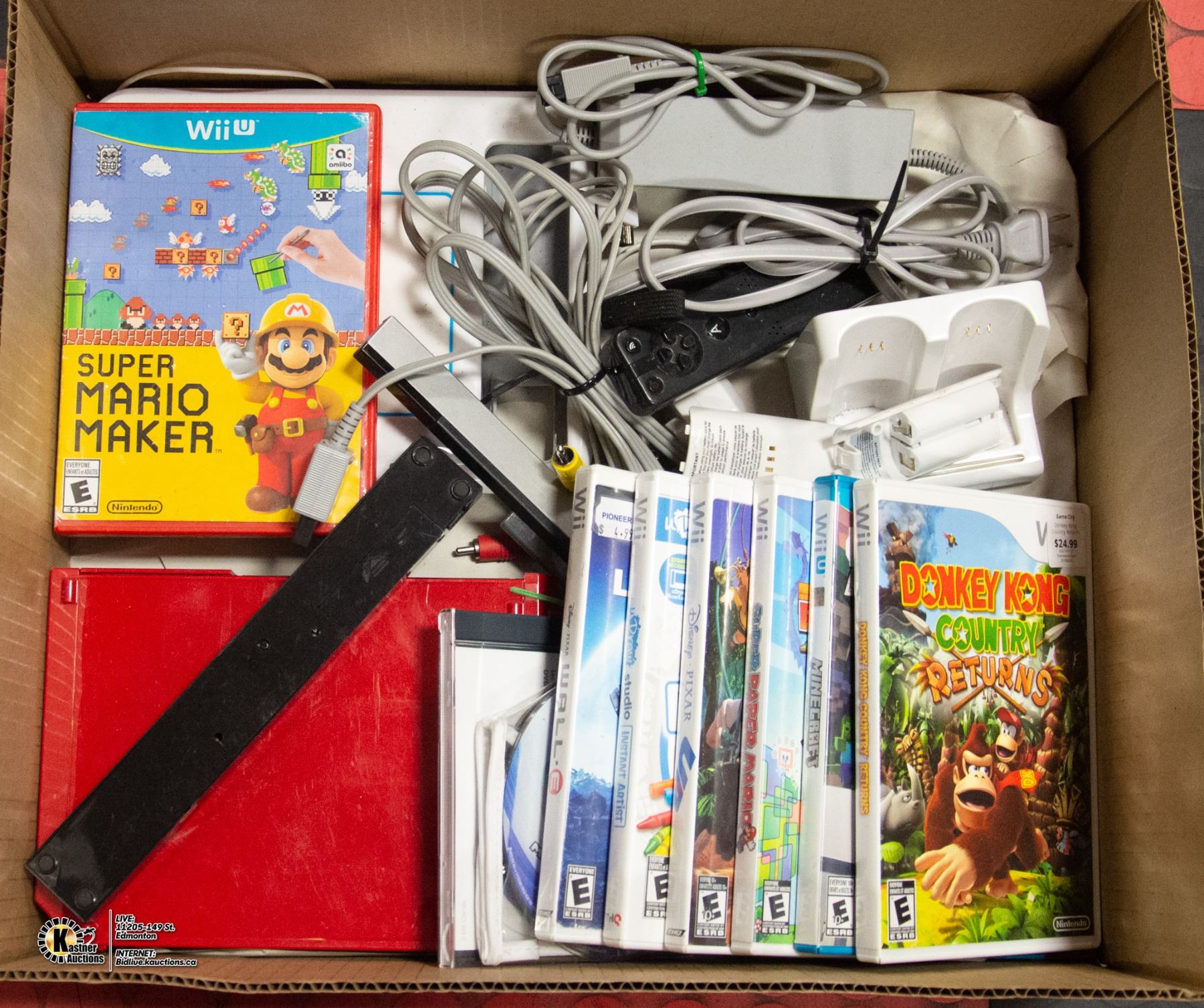 9 GAMES INCL. WII DRAW GAME TABLET, WII SUPER MARIO MAKER, MARIO KART, DRAW STUDIO, DONKEY KONG COUNTRY, REMOTE CHANGING BASE, ETC.