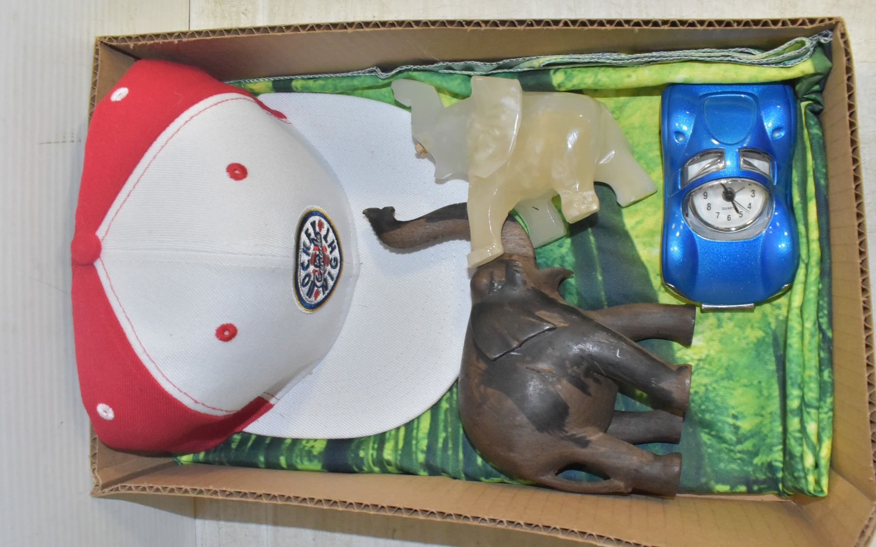 BOX WITH WOOD ELEPHANT, MARBLE ELEPHANT,