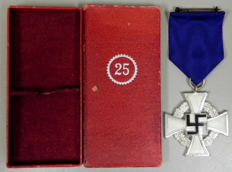 THIS IS A RARE NAZI 25 YEAR FAITHFUL SERVICE CROSS AWARD IN ORIGINAL PRESENTATION BOX--CORNFLOWER BLUE RIBBON WITH MINT MEDAL-MALTESE CROSS WITH A BLACK ENAMEL SWASTIKA IN CENTER-REVERSE HAS "FUR TREUE DIENST".--ALL THE ORIGINAL HIGHLIGHTING AND FROSTING REMAINS ON AWARD--THE BOX IS RED, FITTED FOR THE MEDAL AND HAS "25" ON THE TOP--INSIDE COVER MAKER LABEL READS "WACHTLER & LANGE-MITTWEIDA".