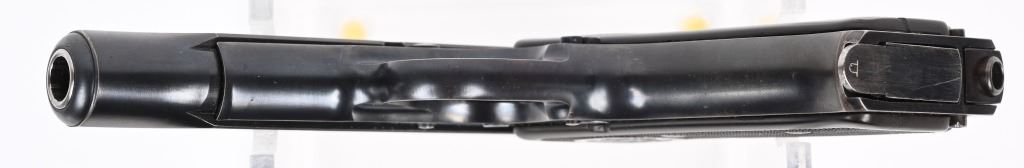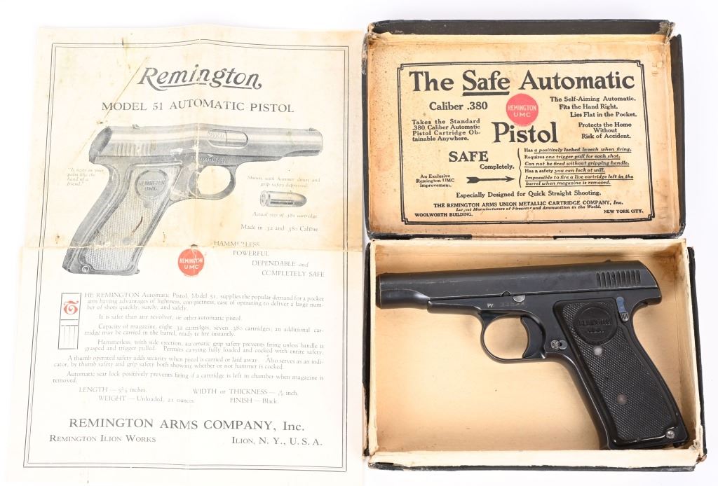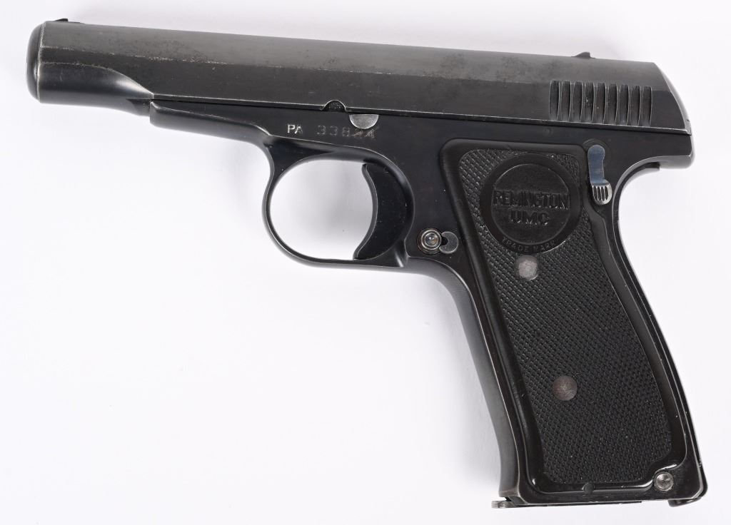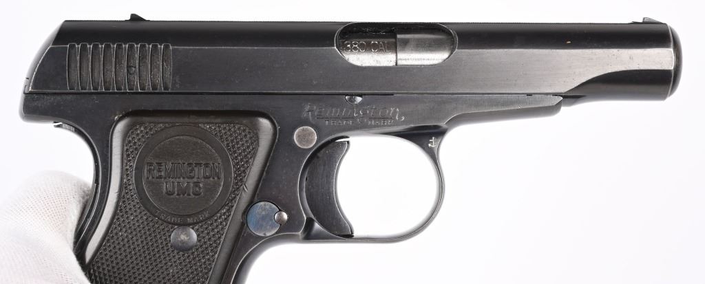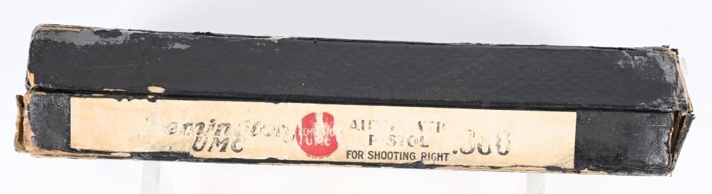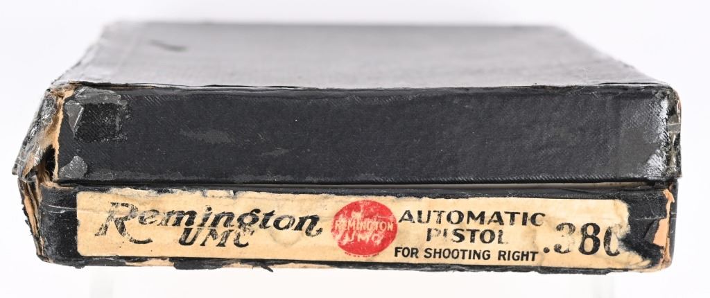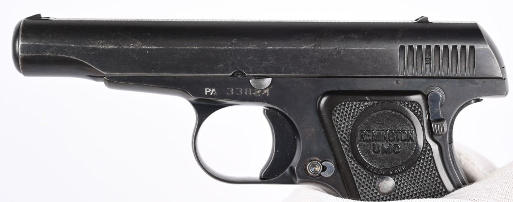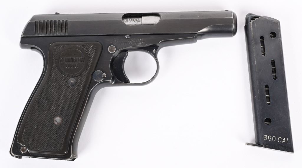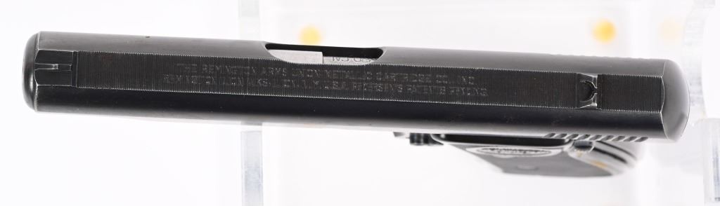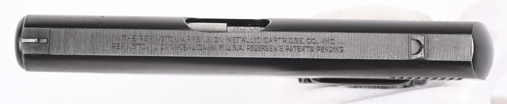 SERIAL PA33824. BARREL 3 1/4". CALIBER .380. Made from 1918 to 1934. The top of the slide is serrated and has two line address with patent pending. Fixed sights, 9 groove slide, black checkered grips with the Remington-UMC. Comes with the correct box and instructions. Condition Gun shows some high edge toning and a few freckles but still a solid 97% and comes with one magazine. Bore is crisp. Grips are excellent. Bold legends and still has fire blue on some small parts. C&R