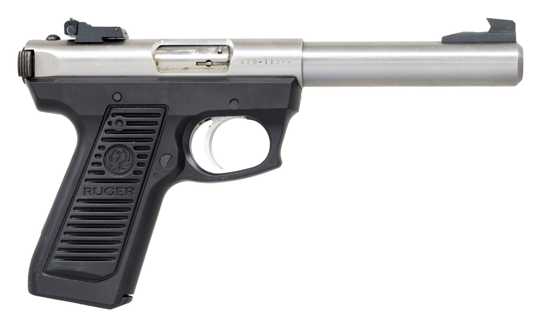 Cal. 22 LR. S# 220-11395. Bbl. 5 1/2' stainless bull with blued sights of undercut screw attached front and receiver mounted factory adjustable rear. Mfg. 1992 (1992-2005) as Mark II variation having stainless receiver and barrel; balance is blued plus synthetic grip frame with integral grips having Ruger logo and horizontal grooves. MAGS: 3 factory 10 rd. UNATTACHED ACCESSORIES: unlabeled factory grey plastic case with packaging. CONDITION: an occasional, very faint handling mark plus firing residue in receiver; balance is near excellent including bore. (25-4881/NW). MODERN. $200-350.