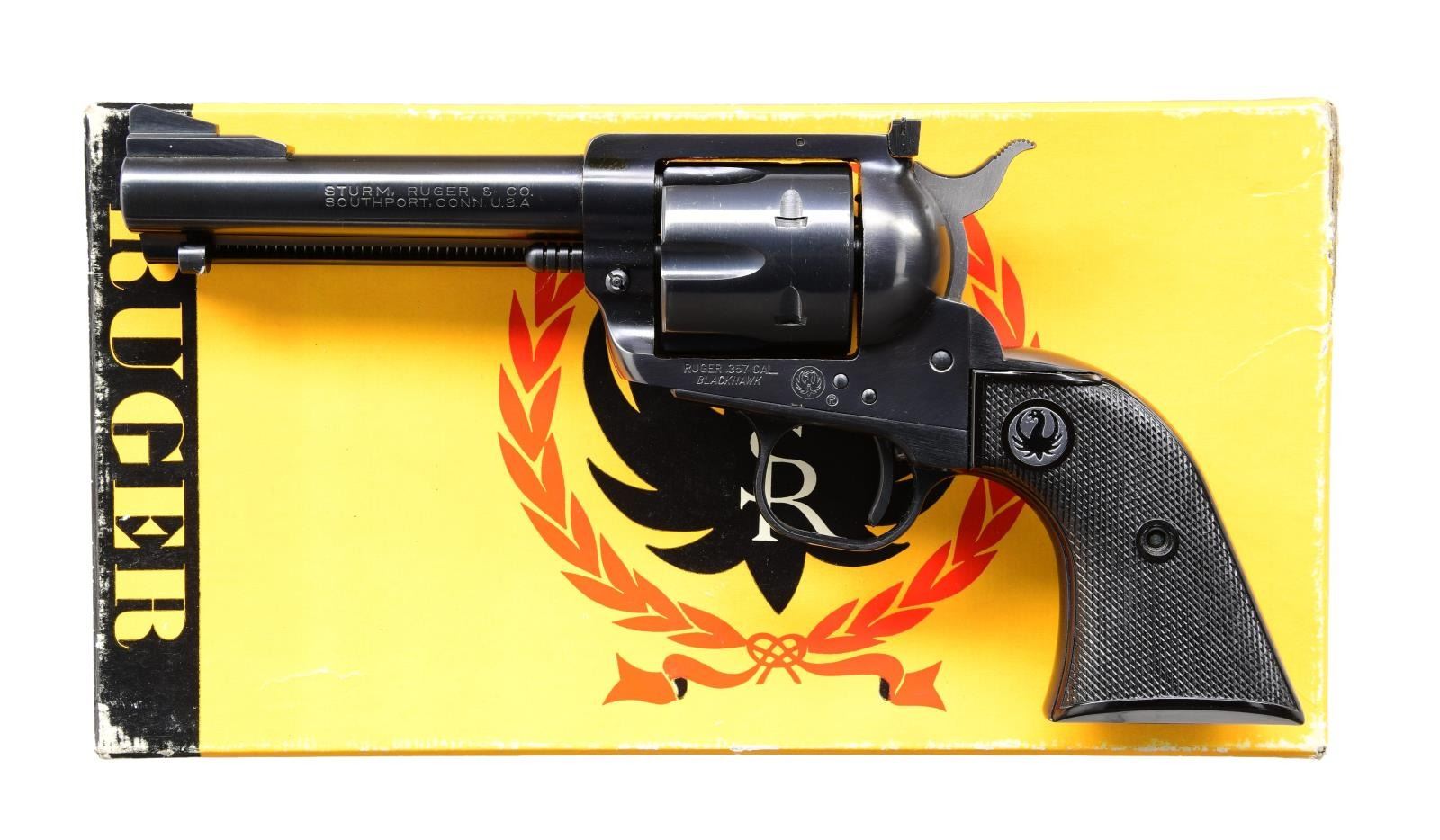 BOXED RUGER 357 FLAT TOP BLACKHAWK REVOLVER.