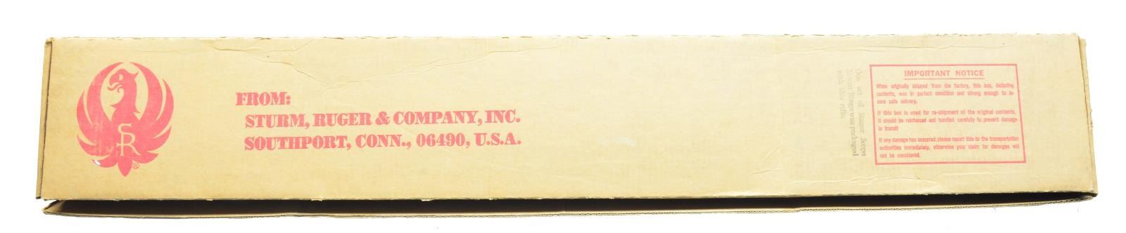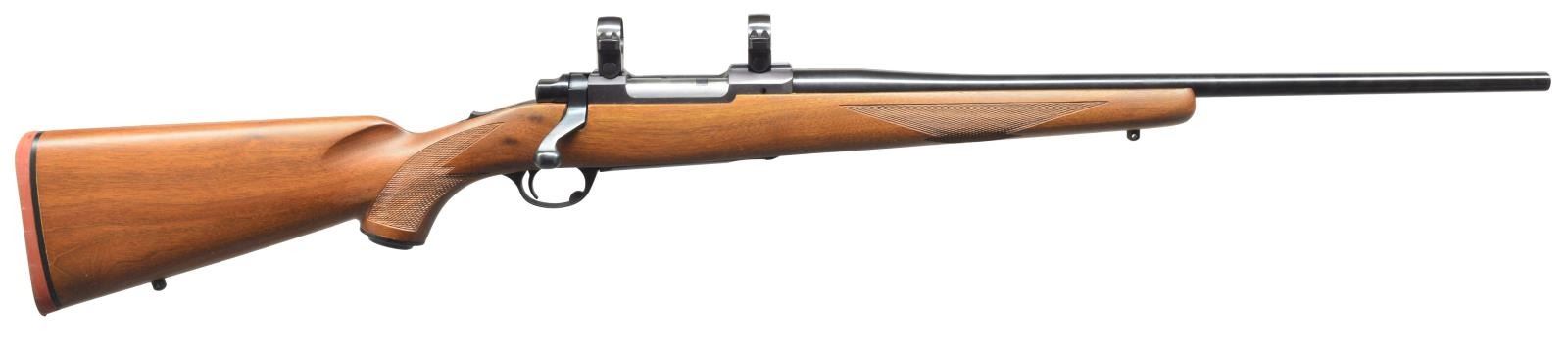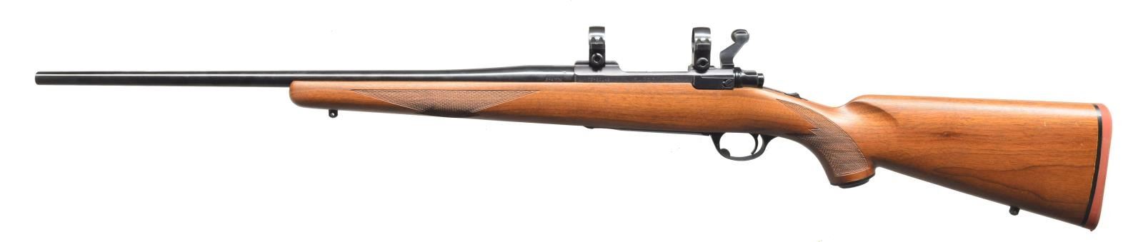 Cal. 284 Win. S# 70-30142. Bbl. 22” rnd. made w/ out sights. Checkered stock. Checkered pistol grip w/ black hard rubber grip cap w/ Ruger emblem. Solid red Ruger recoil pad. Bolt has etched matching number. UNATTACHED ACCESORIES: w/ original cardboard box which contains paperwork. CONDITION: bbl. retains most of its original blue w/ a couple minor spots of surface oxidation. Receiver retains most of its original blue w/ slight wear on sharp edges. Floorplate & trigger guard retain original finish w/ a minor mark on each. Stock retains original finish w/ some minor handling marks. Bore is good. (20-4165/BT). MODERN. $600-900.