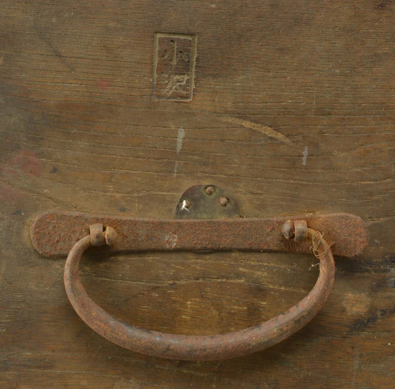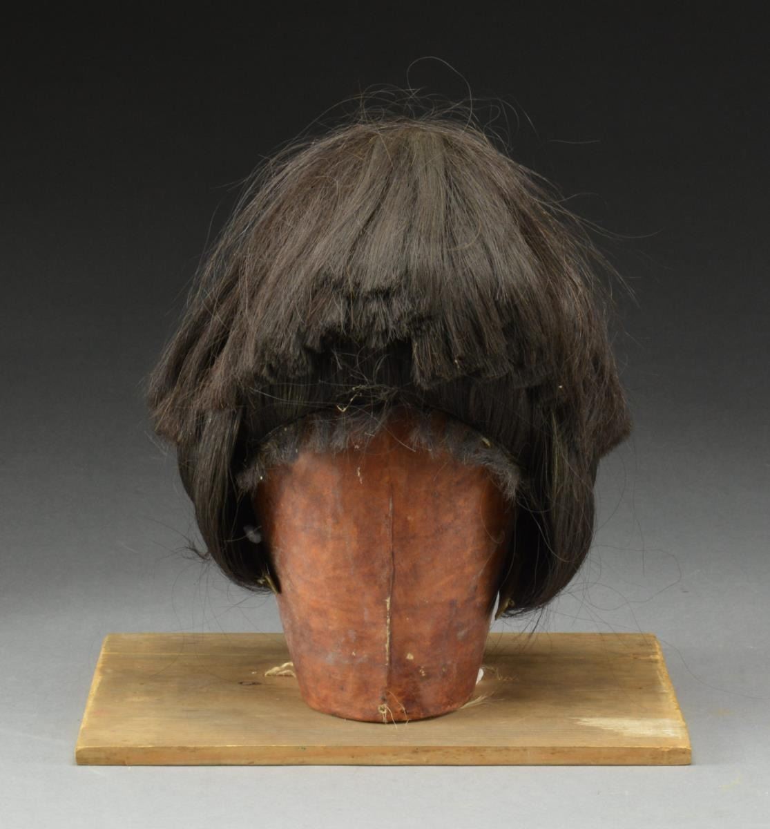 A fascinating, early wig that appears to be for a Samurai lord or warrior. The wig is housed in an early wooden box measuring 12 1/2" x 12 1/4" x 11 1/2". It has reinforced corners & an iron bail handle. The box has a slide out base that has a formed paperboard wig stand sewn to it. The wig stand has Japanese characters on the front & has a faux wood finish. The black wig is tied w/ a top knot form utilizing light blue silk cord. The tanto measures 12 1/4" overall & has an 8" blade. It is difficult to discern a hamon but it appears straight. Silver habaki w/ spire like design. Nakago has a 2 character signature & a single mekugi-ano. Saya & tsuka are black enameled wood. CONDITION: wig box shows great age but remains quite solid. The wig, incredibly, shows nearly no wear & remains in its original shape w/ all of its hair intact. Tanto blade has been improperly cleaned & sharpened but shows no major damage. Saya & tsuka show light wear. (02-15149/BF). $500-800.