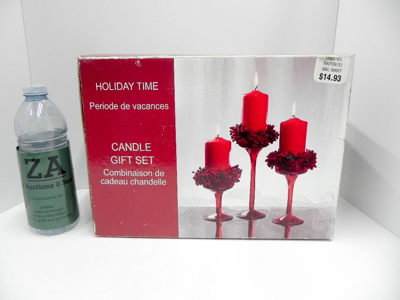 BOXED SET HOLIDAY TIME CANDLE GIFT SET. GLASS IS PROBLEM FREE AND SO ARE THE HEAVY BERRY WREATHS