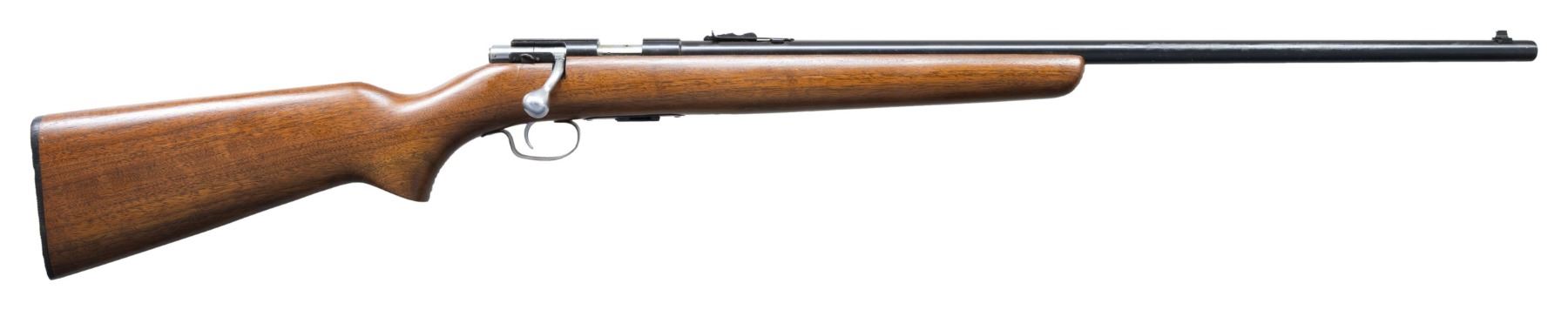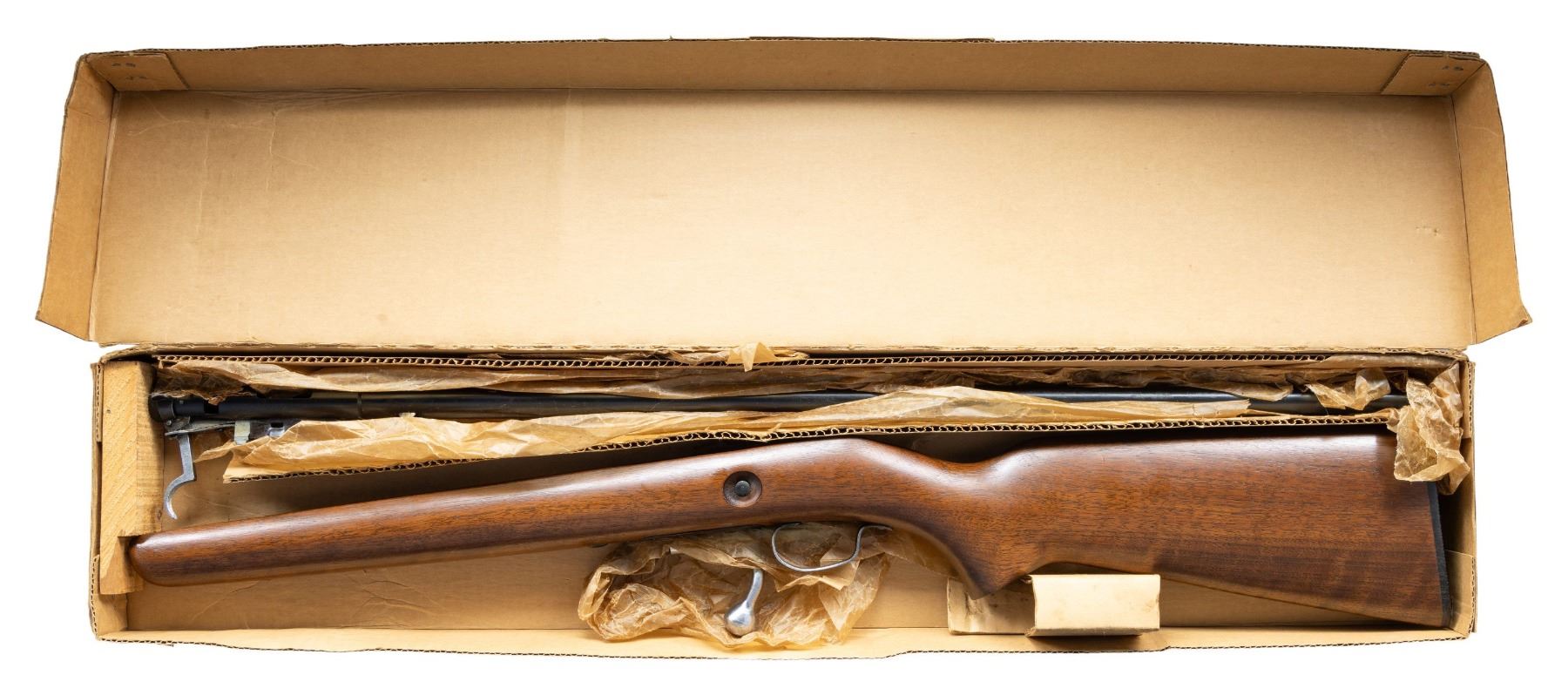 Cal. 22 S, L, LR. NSN. Bbl. 25" rnd. Bead front sight with sporting rear sight. Action is grooved for tip off scope mounts. Blue finish with nickel finished bolt, trigger, and trigger guard. Pistol grip walnut stock has original plastic buttplate. MAGS: 1 detachable 5-rd. UNATTACHED ACCESSORIES: original box with proper white label having blue writing. Handwritten original price on the box is $33.75. Box contains original dividers and wrapping paper. CONDITION: near new. Bbl. and action retain virtually all original blue. Bolt and trigger have excellent nickel finish. Nickel finish on trigger guard have largely faded to brown patina. Very good original stock finish shows a few small marks. Bright near excellent bore. Metal parts have a heavy coating of grease for long term storage. Box is in generally good condition showing some tape marks staining on label. PROVENANCE: Estate of Russell Dickerman. (25-1962/DS). CURIO. $800-1,200.