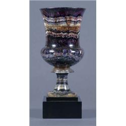 BOXES AND OBJECTS - A Blue John campana vase, of good colour, the flared pedestal with blade knop, on stepped square black slate base, 10in high, early - mid 19th century (slight rim chip) (see illustration)