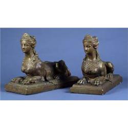 BOXES AND OBJECTS - A pair of early 19th century gilt plaster library sphinxes, each with Grecian head-dress and scaled breastplate, resting on cavetto moulded rectangular plinths, 14in long, 11in high (repairs, now gold painted) (see illustration)