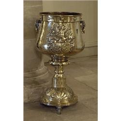 BOXES AND OBJECTS - A large Dutch brass jardinière, in 17th century style, the circular bowl with bold lion mask loose ring handles and embossed with coats of arms, raised on a knopped pedestal, the domed circular base embossed with lunettes and shells, on paw feet, 20in diam, 42in high, late 19th century (see illustration) Literature: Country Life, 1913, illus.