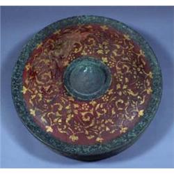 BOXES AND OBJECTS - A 19th century Indian bronze gong, the broad iron red border gilt with leaf scrolls, 26.5in diam