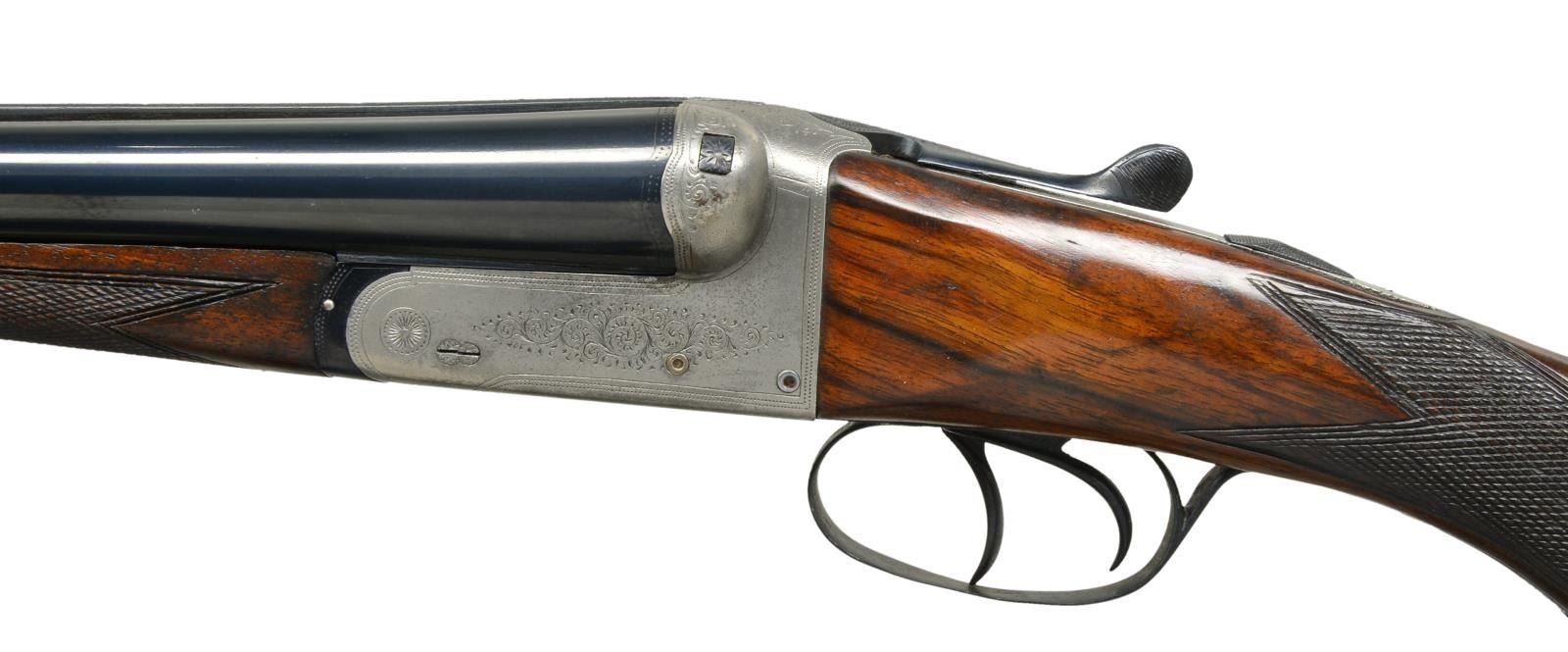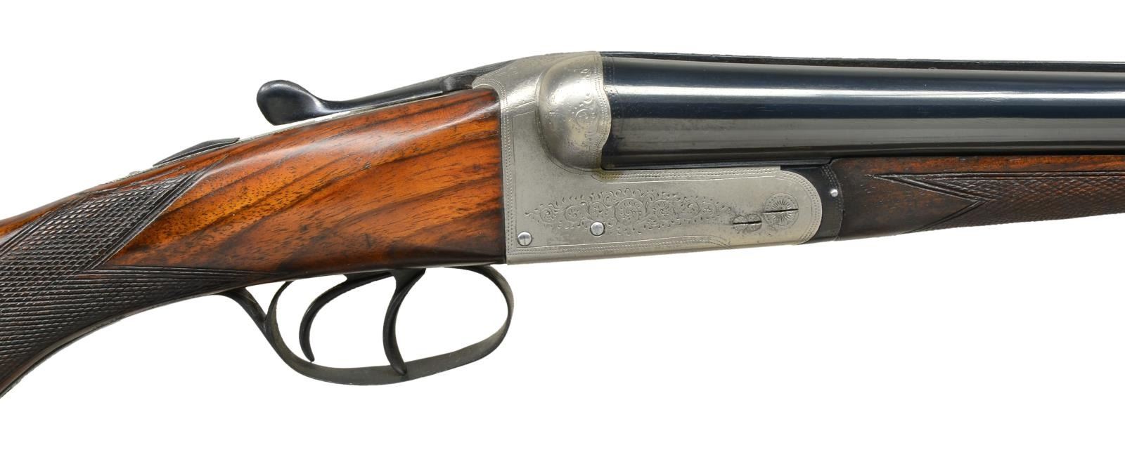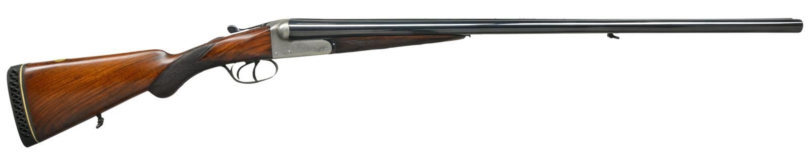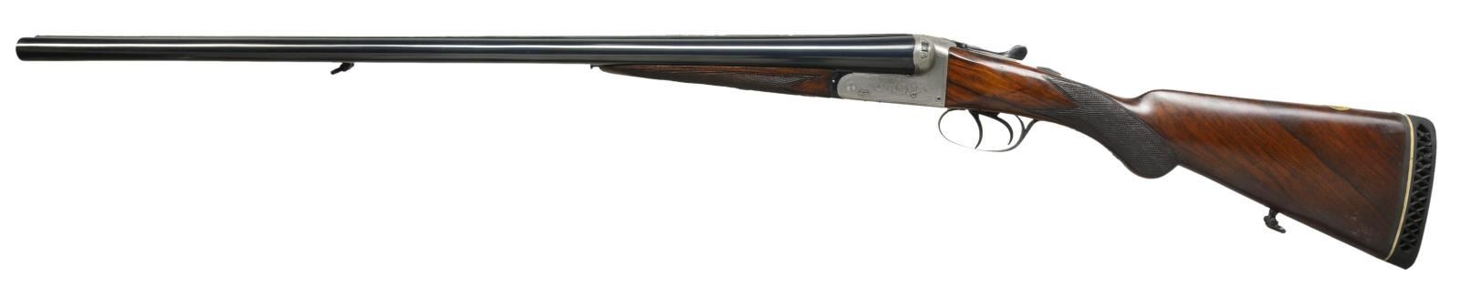 BARCELONA. Cal. 12 Ga., 2 3/4". S# 24034. 28" Dovetailed bbls. w/ matted game rib are marked with E. Schilling information and address on tops. Bbl. flats are stamped with pre 1927 Barcelona proofs for 12 ga. Sling loop is screwed to bottom rib. Coin finished boxlock action features automatic safety, square crossbolt third fastener, sideclips, and double triggers. Action is engraved w/ sprays of scroll within double punchdot borders. Rnd. knob pistol grip buttstock of lightly streaked European walnut measures 14 3/8" over black "Whiteline" pad. Point pattern checkering is at grip. Matching splinter ejector forend has Anson release. MEASUREMENTS: BBLS: Bore Diameter: R .734", L .729". Restriction: R .025" (MOD), L .035" (FULL). Min. Wall Thickness: R .016", L .017". STOCK: DAH: 2 5/8". DAC: 1 5/8+". LOP: 14 3/8". CAST: approx. 1/4" off. WEIGHT: 6 lb. 2 oz. CONDITION: good as refurbished. Bbls. retaining nearly all of a reblack. Engraving softened. Action cleaned to coin finish over considerable light pitting. Engraving soft. Screws show considerable use. Stocks have old oil refinish, wood is slightly under metal. Checkering roughly recut. Bores are shiny but show considerable pitting throughout along with riveling associated with thin spots in both bbls. Action is tight. Ejectors are in time. (22-4532/MGM). CURIO. $600-1,000.
