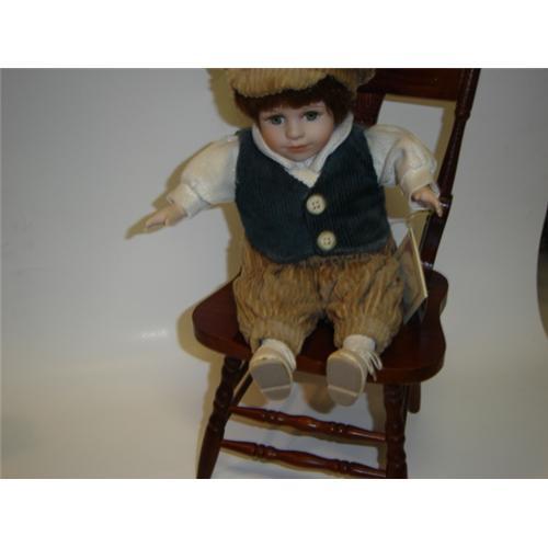 LITTLE BOY DOLL PORCELAIN SITTING ON CHERRY WOOD CHAIR 12 INCHES THE CHAIR AND 8 INCHES THE SITTING BOY.