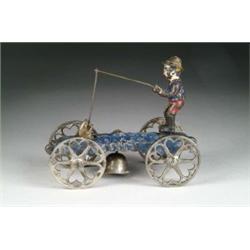 BOY FISHING BELL TOY. Manufactured by N. N. Hill Brass Co. Comical action of a boy fishing, all of the sudden he rears back and pulls in his catch. Gaily painted with nickel wheels and fish, this is a difficult toy to find. SIZE: 6”. CONDITION: Overall paint condition fair to good, base painted dark blue over lighter blue but paint appears to be original. JL 1-4070 (1,400-1,600)
