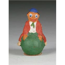 BOY ON LIME CANDY CONTAINER. Wide-eyed boy with pumpkin colored face straddles lime fruit container. SIZE: 3 1/4” t. CONDITION: Fine condition. WP 1-3737 (400-600)