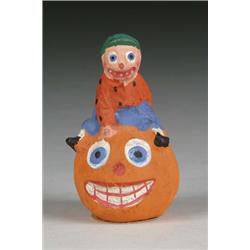 BOY ON PUMPKIN CONTAINER. All composition depiction of wide-eyed boy on jack-o-lantern candy container. SIZE: 3 1/2” t. CONDITION: Very fine condition. WP 1-3742 (350-450)
