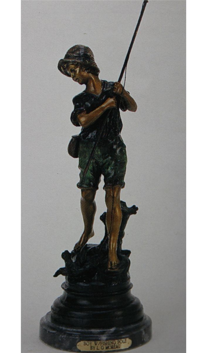 "BOY WITH FISHING POLE" BRONZE SCULPTURE - AFTER A. MOREAU - MUSEUM BROWN FINISH - MOUNTED ON A FINE ITALIAN MARBLE BASE - BEAUTIFULLY DETAILED - SIGNED - MINT CONDITION - 20" X 8"W - LOST WAX CAST BRONZE