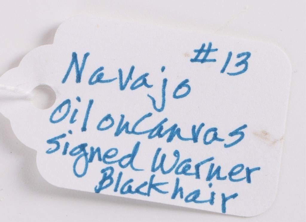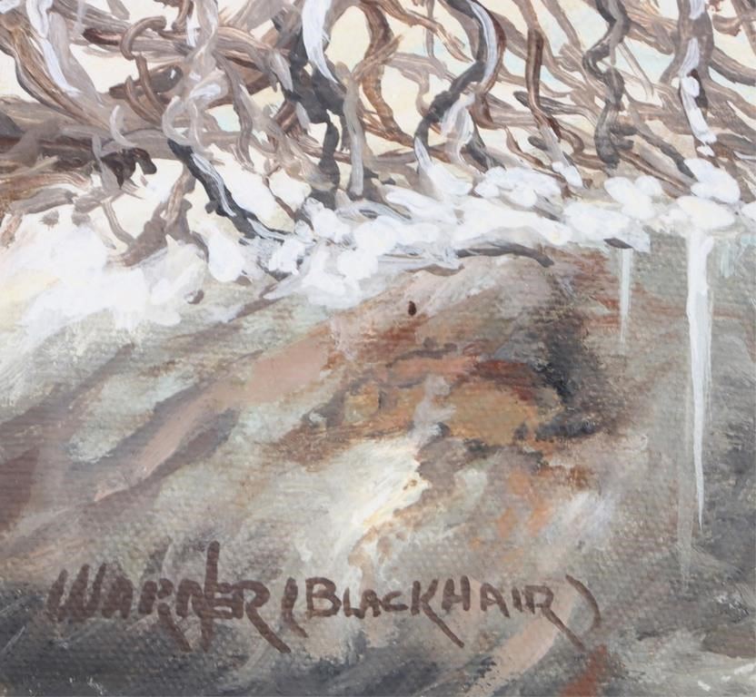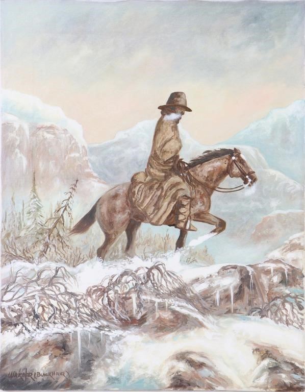 Boyd Blackhair Warner (American, 1937-2014) Navajo oil on canvas to depict a man riding his horse amidst the snowy mountains. Boyd Warner Jr. (1937-2014) was a Navajo artist with the Indian name Blackhair. He has worked in oil, acrylic, watercolor, tempera, sand and mixed media. This artist depicted cultural icons of his people as well as those related to various Pueblo people. Warner competed in art exhibits and shows as early as 1968. He won awards at Gallup Inter-Tribal ceremonials, at the Heard Museum Indian Markets, The New Mexico State Fair and at the Scottsdale National Indian Arts and Crafts for several years.
