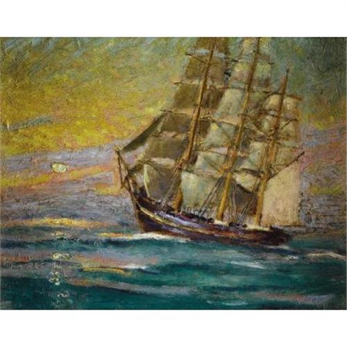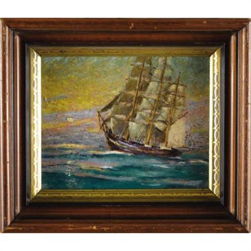 <B>BOYER GONZALES, SR.</B></I> <B>(1864-1934)<BR></B></I><I>Failing Breezes</B></I>, 1921<BR>Oil on artistboard<BR>8 x 10 inches (20.3 x 25.4 cm)<BR>Signed lower right<BR>Titled verso<BR><BR> Gonzales' marine paintings are considered to be his finest and most desirable work. This is a particularly fine example of Gonazales' impressionist ship paintings and was exhibited at the Salmagundi Club in the 1921 Thumb Box Exhibition. The surface is rich with impasto and sparkles with color. The sun is low on the horizon, half obscured by a cloud, and the sky glows yellow, rose, and mauve.<BR><BR>The painting was given as a wedding present to the current owner's parents.<BR><BR>Provenance:<BR>Betty Roup (wedding present)<BR>By descent to Greta McAndrews<BR><BR>Exhibited:<BR>Salmagundi Club, Thumb Box Exhibition, 1921<BR><BR><B>Condition Report:</B> Excellent condition. Period frame in excellent condition.<BR><BR><b>Shipping:</b> Requires 3rd Party Shipping (<a target="_blank" href="http://www.heritageauctions.com/common/shipping.php">view shipping information</a>)