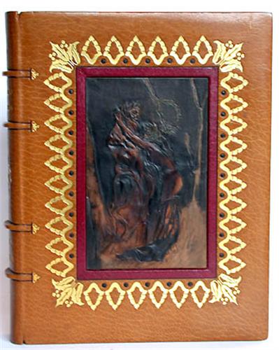 BOYER d'AGEN; de ROIG, J.- Rops... iana. Paris, Pellet, 1924. In-8° (qqs piqûres p. 9) Relié par Franz : plein maroquin lavallière, plat sup. orné d'une plaque de cuir incisé repoussé et coloré inspiré par la gravure érotique "L'idole" cernée d'un listel de maroq. bordeaux et d'une frise dorée, dos à nerfs sertis de filets à froid prolongés sur les plats, plat inf. orné d'un fleuron doré, roulette dorée sur les plats, doublures de tissu broché roux et or cernées de demi-cercles noirs et de fleurons dorés, gardes volantes de même tissu, doubles gardes de papier marbré, tranches dorées, couv. et dos cons. Sous étui.