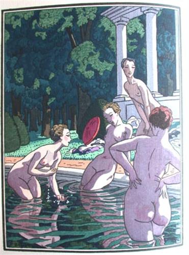 45 compositions en noir rehaussées de couleurs au pochoir : 8 hors-texte dont le plat de la couverture et le frontispice, 20 bandeaux et 18 culs-de-lampe (parfois répétés), 1 vignette sur le 2d plat de la couv. et une autre sur le dos.
