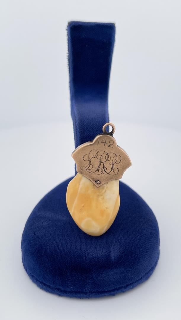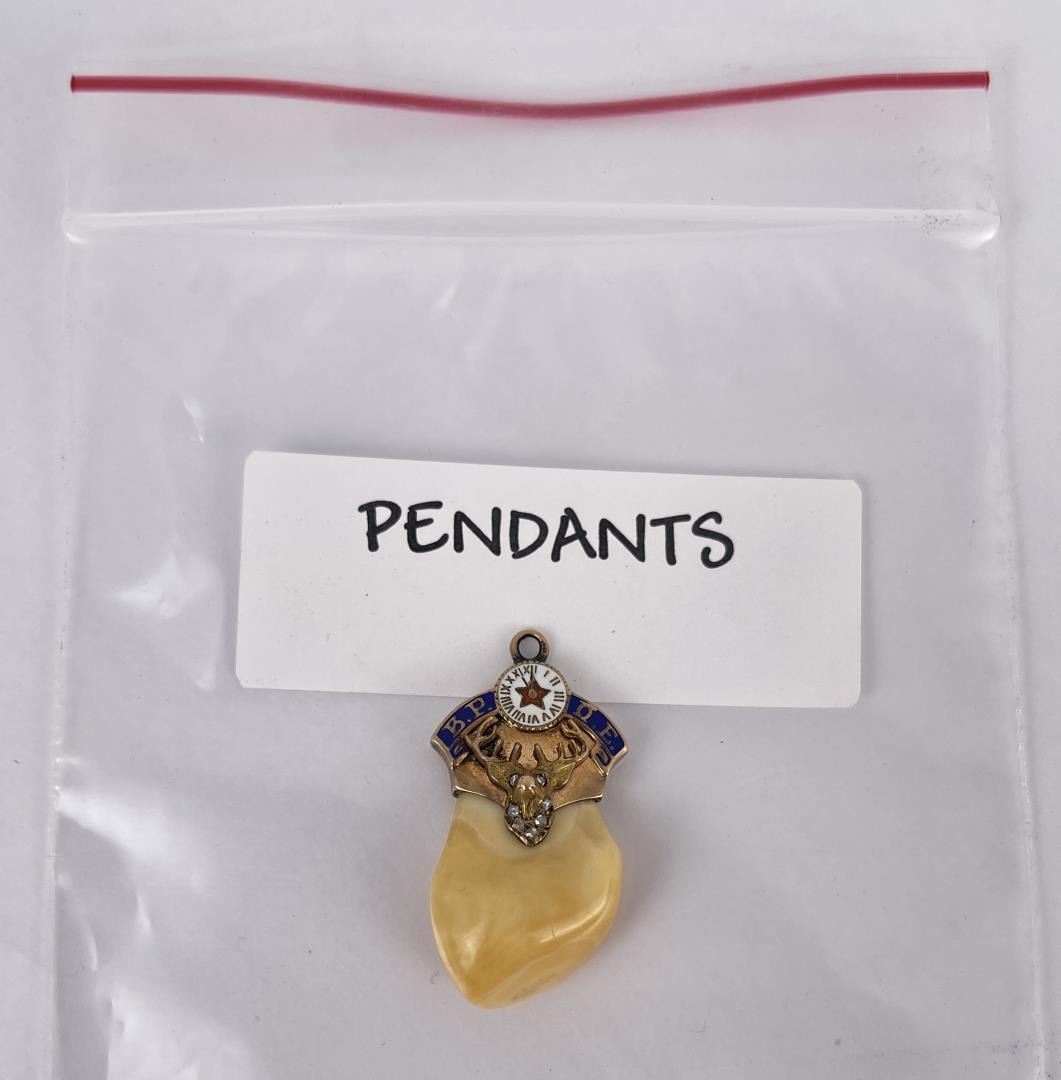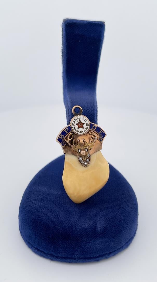 Features clock with red enamel star on a beautifully polished elk tooth, set in 10k gold. Approximately 1 1/2" in length.