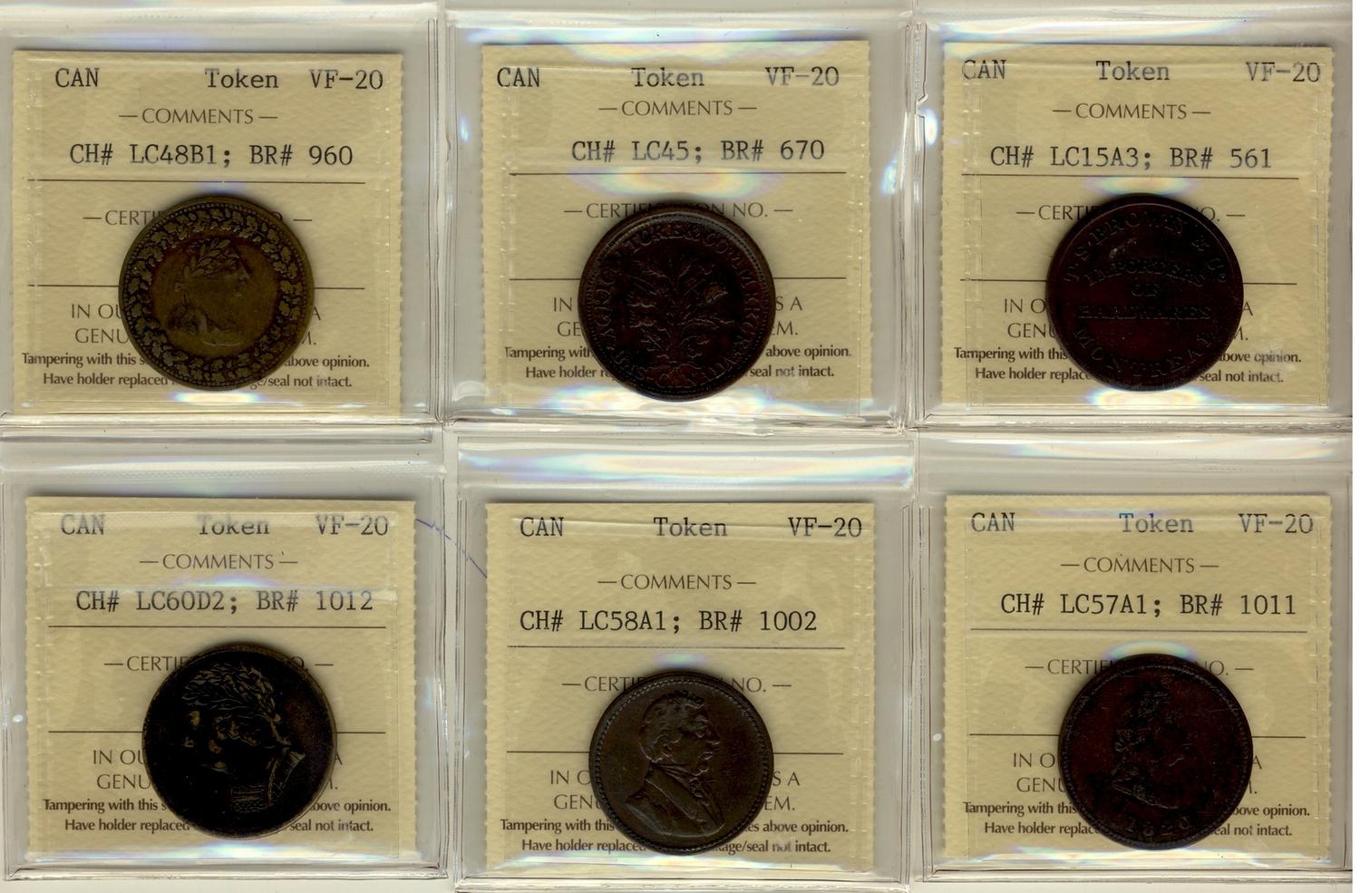 BR: 561 CH LC15A3, BR: 670 CH LC45, BR: 960 CH LC48B1, BR: 1011 CH LC57A1, BR: 1002 CH LC58A1, BR:1012 CH LC60D2, all ICCS VF20. Lot of 6 coins,