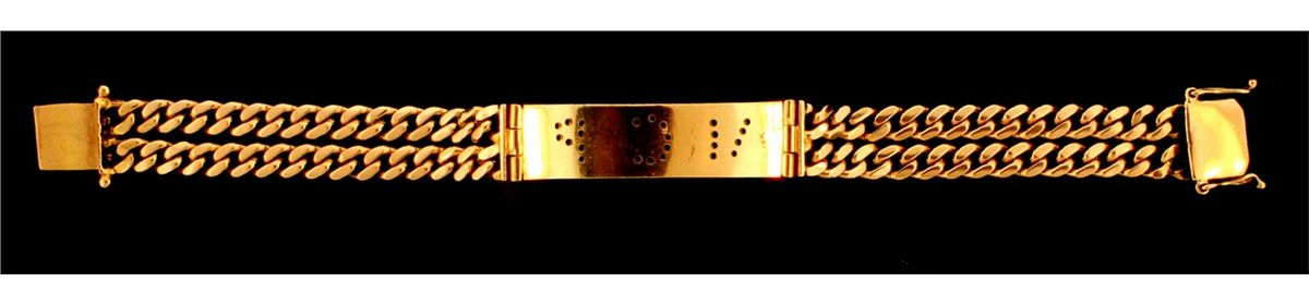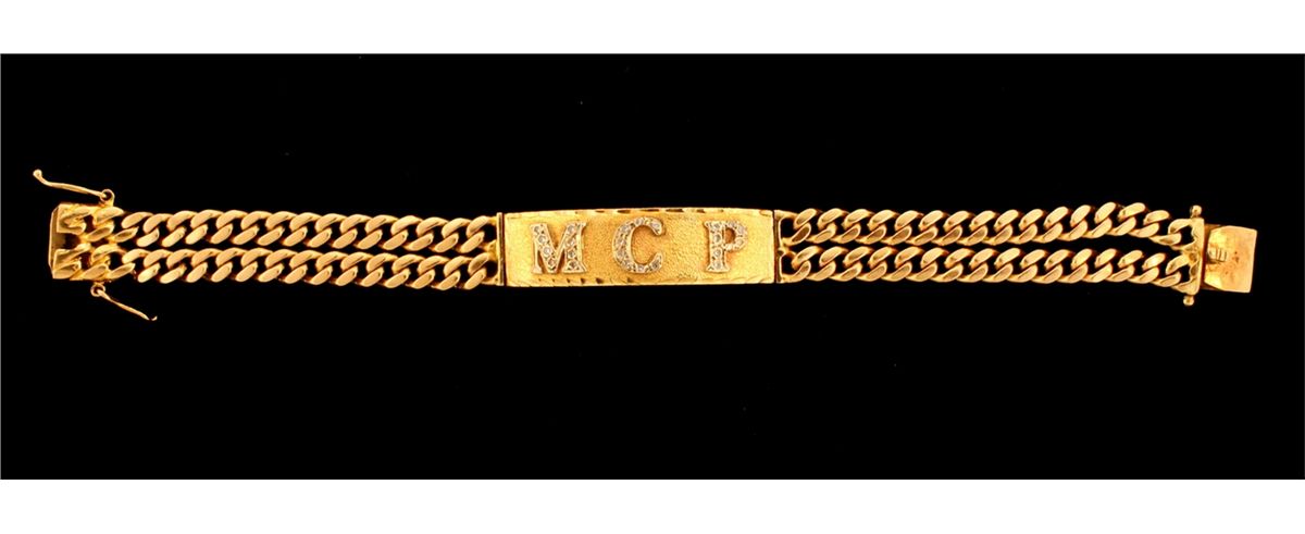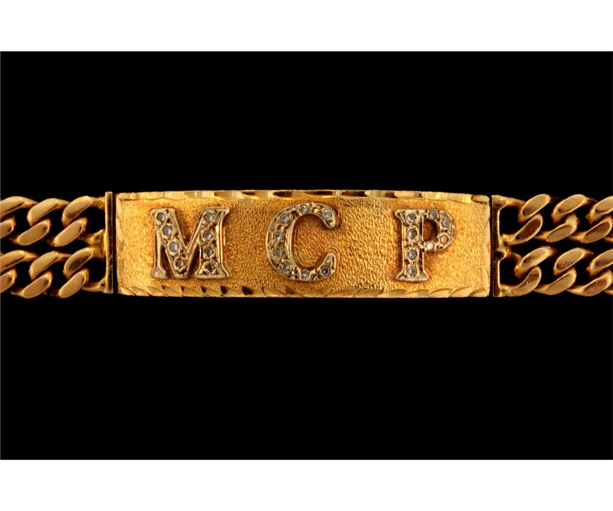 BRACELET: [1] 14KYG and rhodium plated curb link chain ID bracelet with the initials "MCP" set with rd diamonds, est. 0.24 cttw, Fair, I/J, SI2-I1, 8 1/2 inches; 61.8 grams.