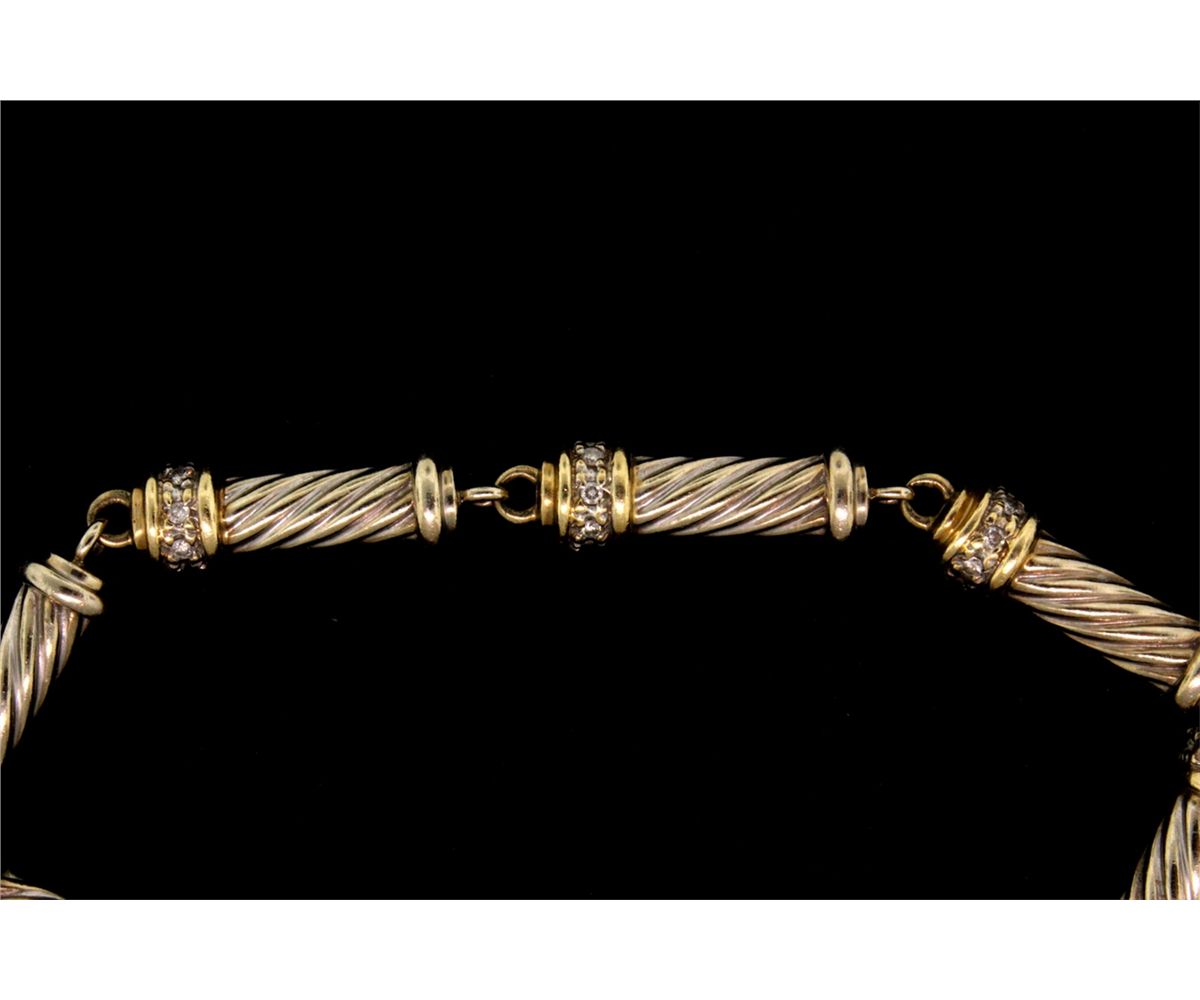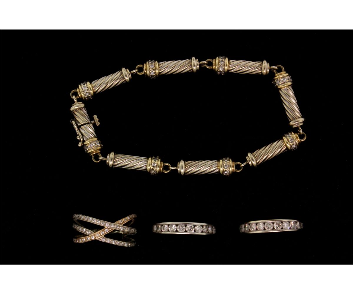 BRACELET: (1) 14kW and YG link bracelet 7" long. Set with (40) approx. 0.01ct. rbc diamonds, color I - M Clarity I-1. Approx. .40cttw. 18.4g. RING: (1) 14kW and YG three band ring with approx. 0.01ct rbc diamonds. Color H - L, Clarity SI - I. Approx. 0.50 cttw. 5.1 grams. Size 7 1/2. Approx. 1 cm wide.RING: (1) 14k WG band with (11) 0.03 to 0.05 ct rbc diamonds. Color G - J, Clarity SI - I. Approx.40cttw. Approx. .4 cm wide. Size 6 1/2. 3.7 grams.RING: (1) 14k WG band with (11) approx. 0.03 to 0.05ct rbc diamonds , Approx. .40cttw. Color G-J, Clarity SI-I. Approx. .4 cm wide. Size 6 1/5. 3.7 grams.