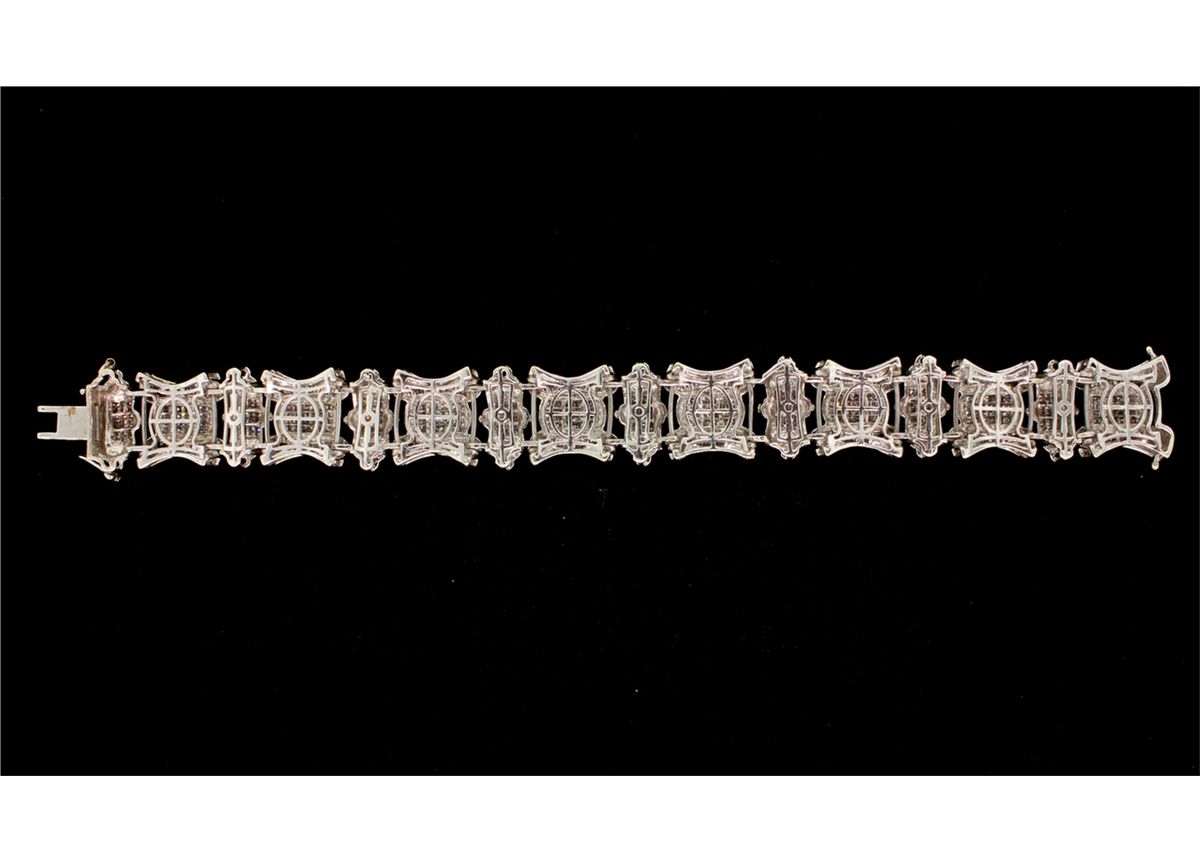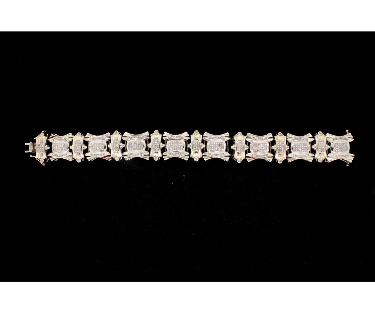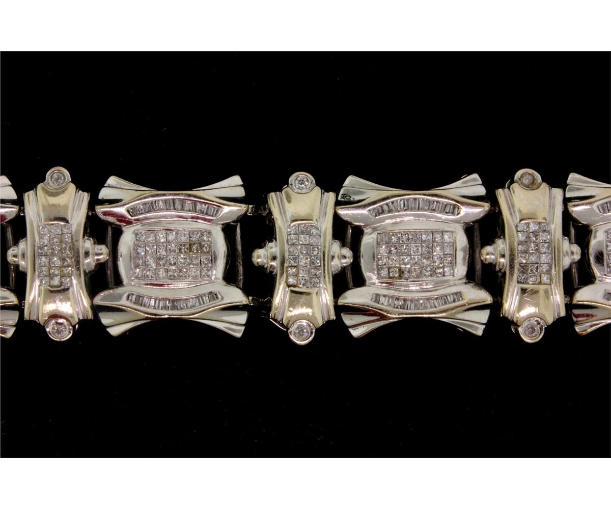 BRACELET: [1] 14kwg and diamond link bracelet, 8 1/4" long x 20.3mm wide, set with (368) invisibly set princess cut dias, (208) baguette cut dias, (16) rbc dias SI2 - I1 clarity, H-I color, approx. 11.28cttw. Hallmarked GD 92.9g.