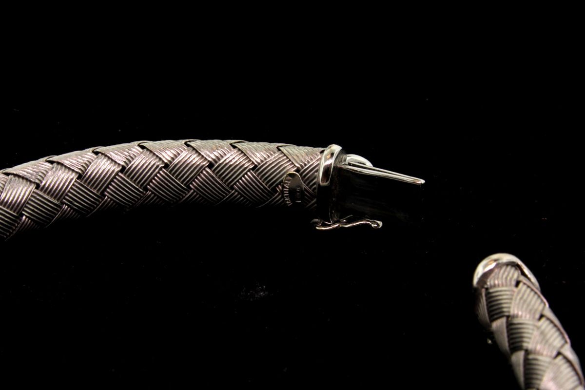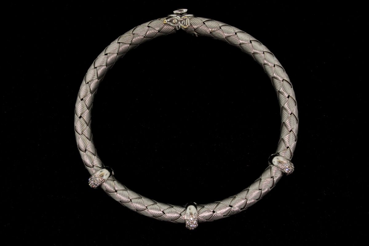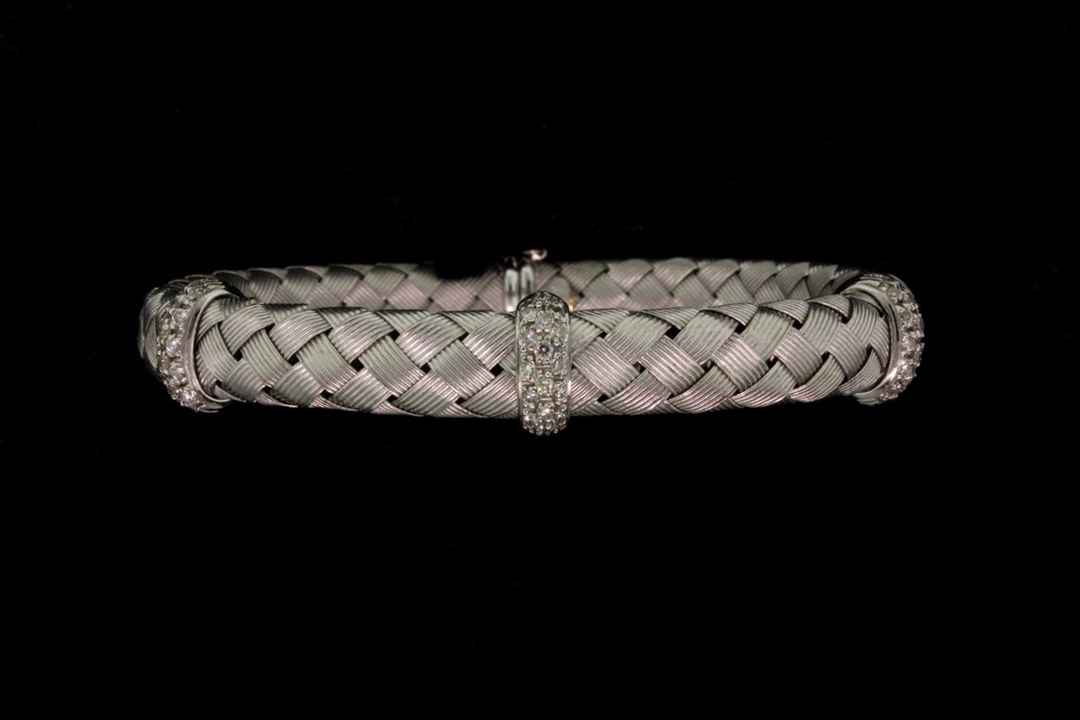 BRACELET: [1] 18KWG flex bangle bracelet by Roberto Coin with a blue sapphire clasp and set with 48 round diamonds, approx. 0.48 cttw., good/ H/I/ VS2-SI1; 25.0 grams
