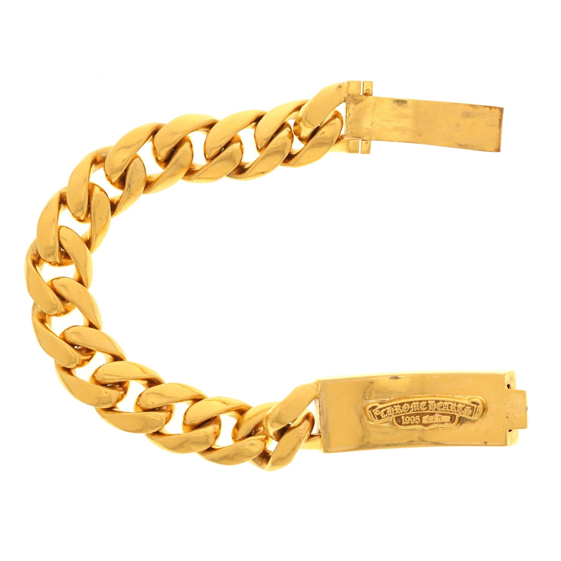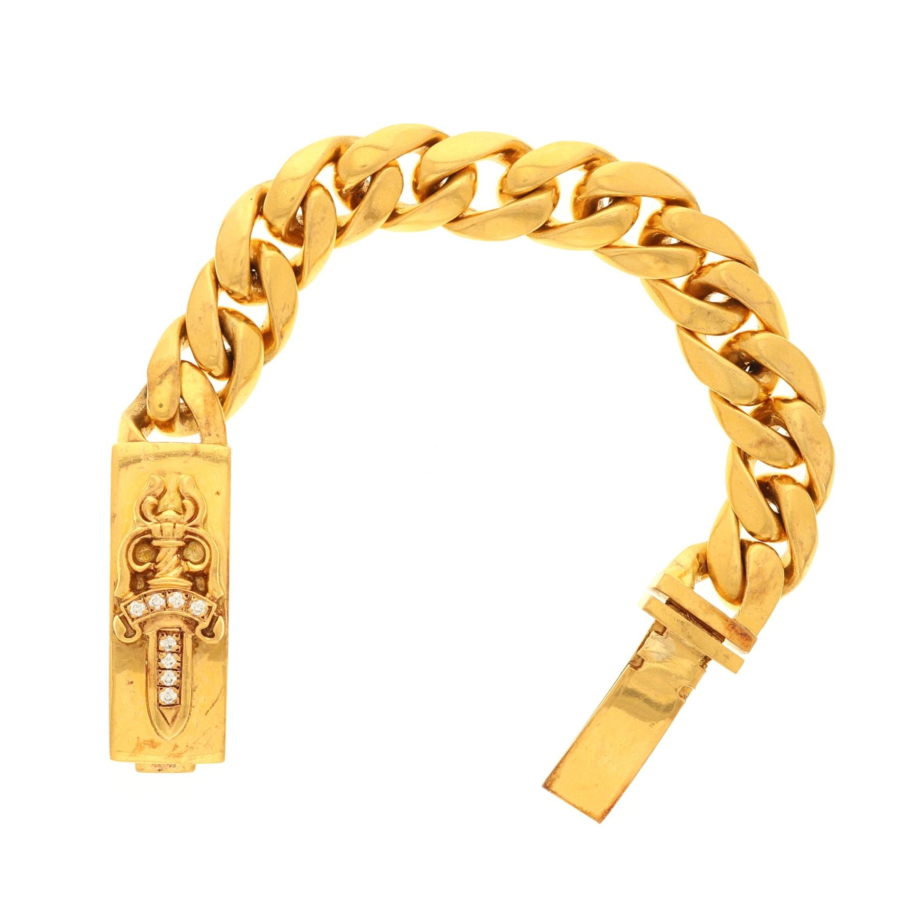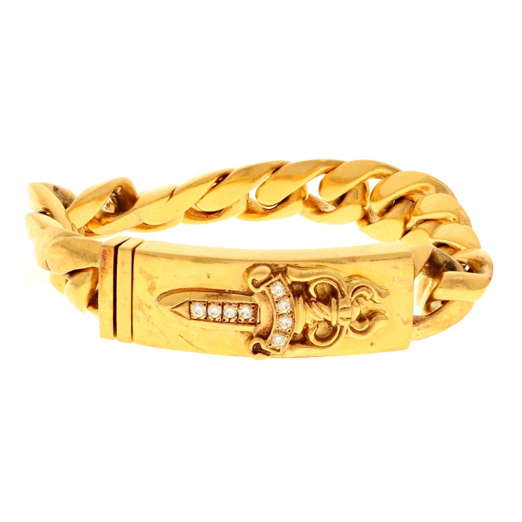 BRACELET: [1] 22kt yellow gold "Chrome Hearts 1995" curb link ID type bracelet; raised dagger set with (8) round brilliant cut diamonds, estimated 0.40 carat total weight, V.Good, G/VS; 8.25" long, hidden clasp; 206.1 grams