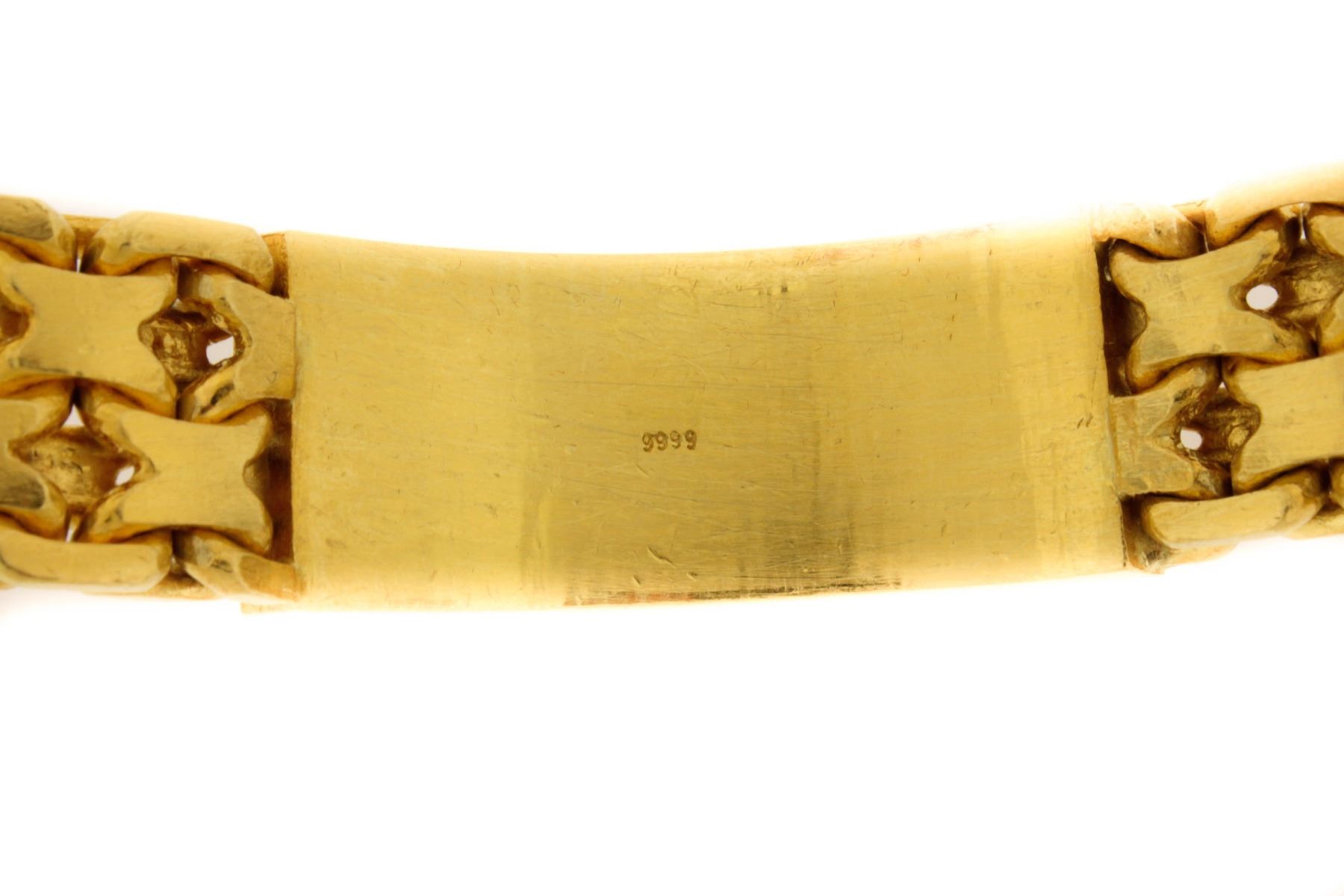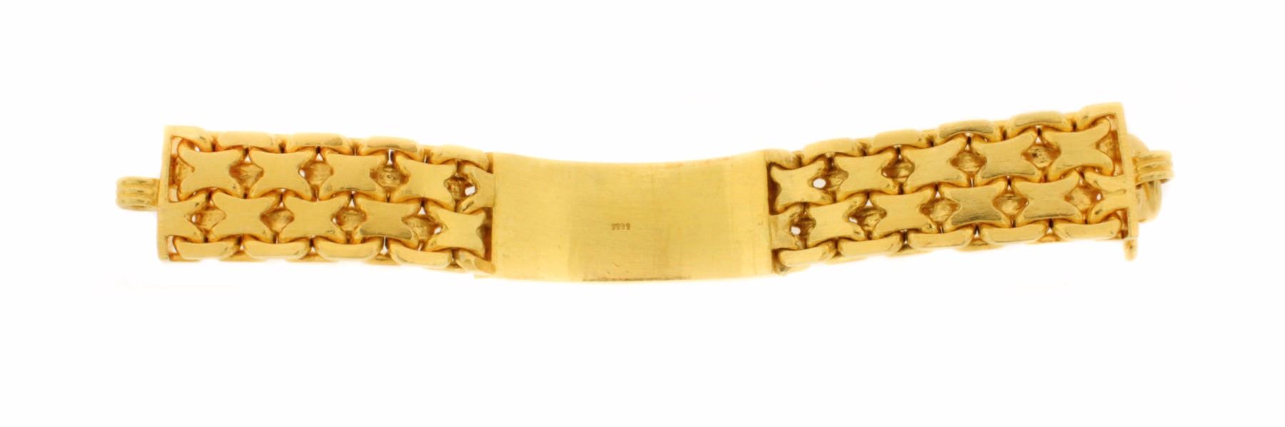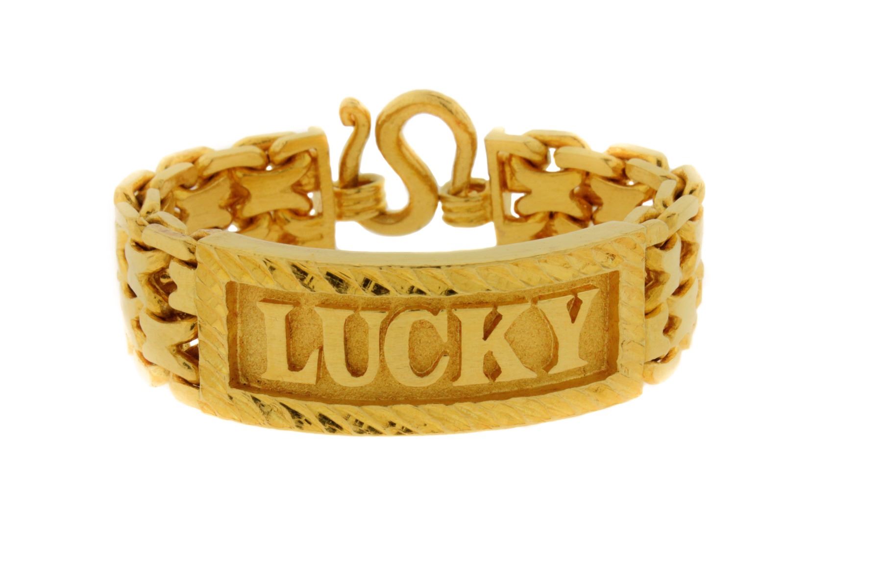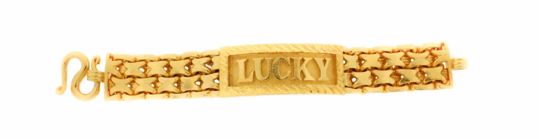 BRACELET: [1] 22kt yellow gold fancy link ID bracelet; ID plate set with raised lettering ''LUCKY'' approximately 7'' long; 225 grams