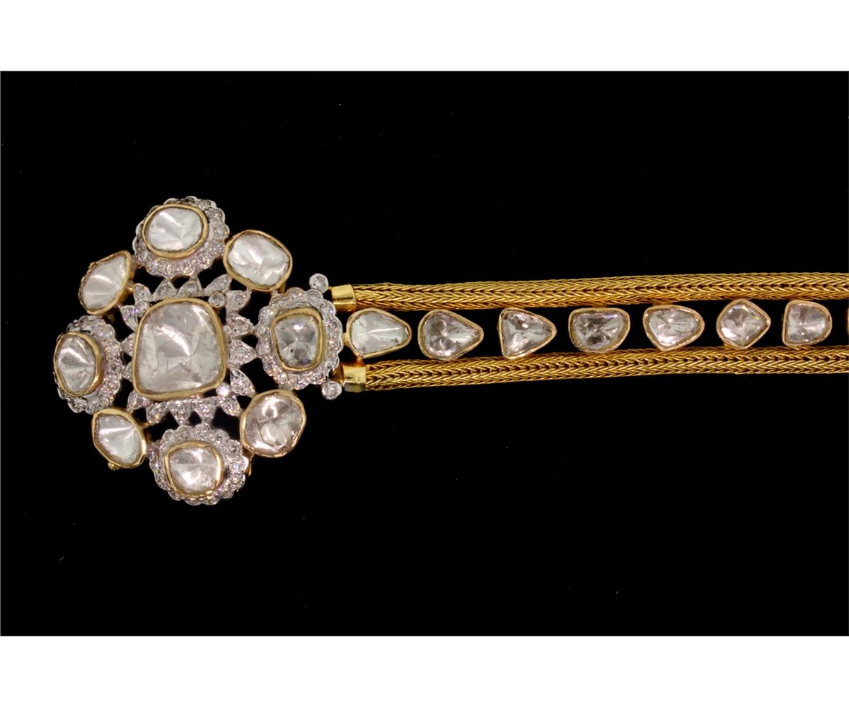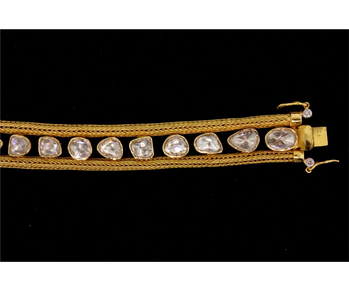 BRACELET: [1] 22kyg and dia bracelet 6 3/4" long. Central large dias are rough cut and backed by foil. There are (76) dias I1 - I2 clarity H-I color. Approx. 8.00cttw. 31.5g.