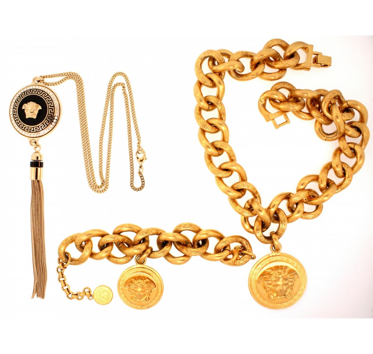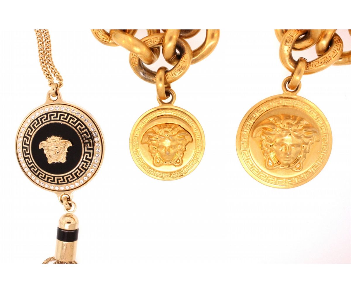 BRACELET: [1] Gold plated Versace link chain bracelet with 1 Medusa charm; adjustable 7"s to 9"s NECKLACE: [1] Gold plated Versace link chain necklace with a gold plated Versace Medusa pendant; 18"s NECKLACE: [1] Gold plated Versace chain necklace with 1 gold plated Medusa pendant with a chain tassel and set with clear synthetic stones and has black enamel accents; 24"s