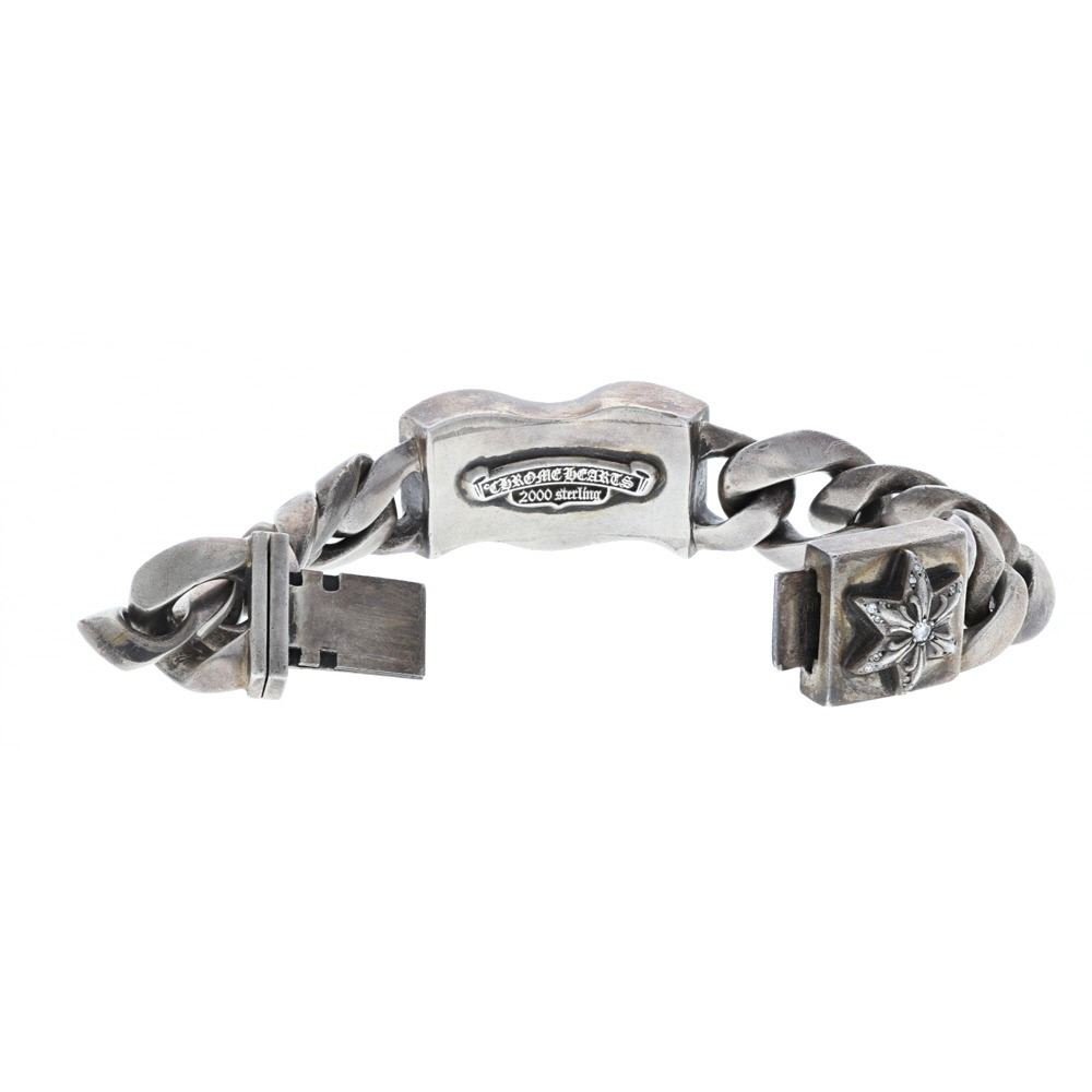 BRACELET: [1] Sterling silver Chrome Hearts curb link "Flag" bracelet set with round brilliant cut diamonds, rubies and sapphires; Flag set with (15) round brilliant cut blue sapphires, approx. 2.6mm, estimated 1.43 carat total weight; (46) round brilliant cut rubies, estimated 1.38 carat total weight; (76) round brilliant cut diamonds, estimated 1.61 carat total weight Good/G-H/VS1-VS2; Clasp set with (16) round brilliant cut diamonds, estimated 0.18 carat total weight, G/H, VS; 8" long; 19.6mm wide; 196.2 grams; "Chrome Hearts 2000"