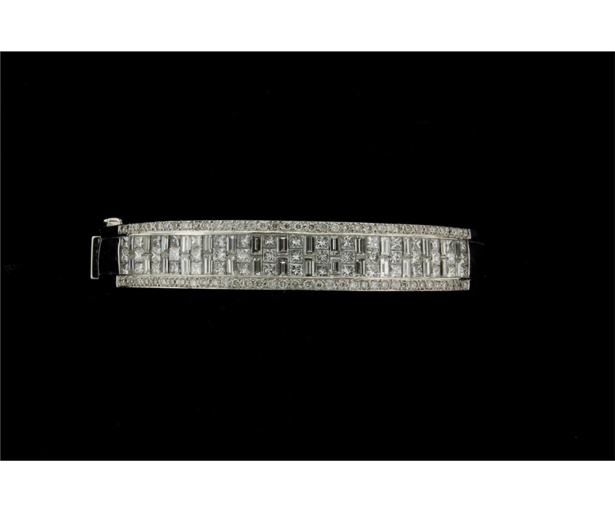 BRACELET: Ladys 18kw ''invisible'' set diamond bangle bracelet (hinged); 32 bag dias, approx 3.1mm x 1.7mm = est 2.04cttw, Good/G-H/VS; 51 sq prin dias, 2.0mm x 2.1mm = est 2.55cttw, Good/G-H/VS1-SI1; 74 rb dias, 1.4mm = est 0.89cttw, Fair-Good/H-J/SI1-I1; oval shape; 68.29 grams.