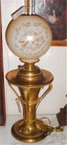 BRADLEY HUBBARD LAMP WITH HANDPAINTED GLASS GLOBE IN A CHERUB THEME, BRONZE BASE, AND CHIMNEY. 33" X