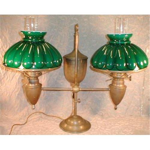 lamp has two antique 10 inch emerald cased glass shades (we believe these shades are original to the lamp)and clear