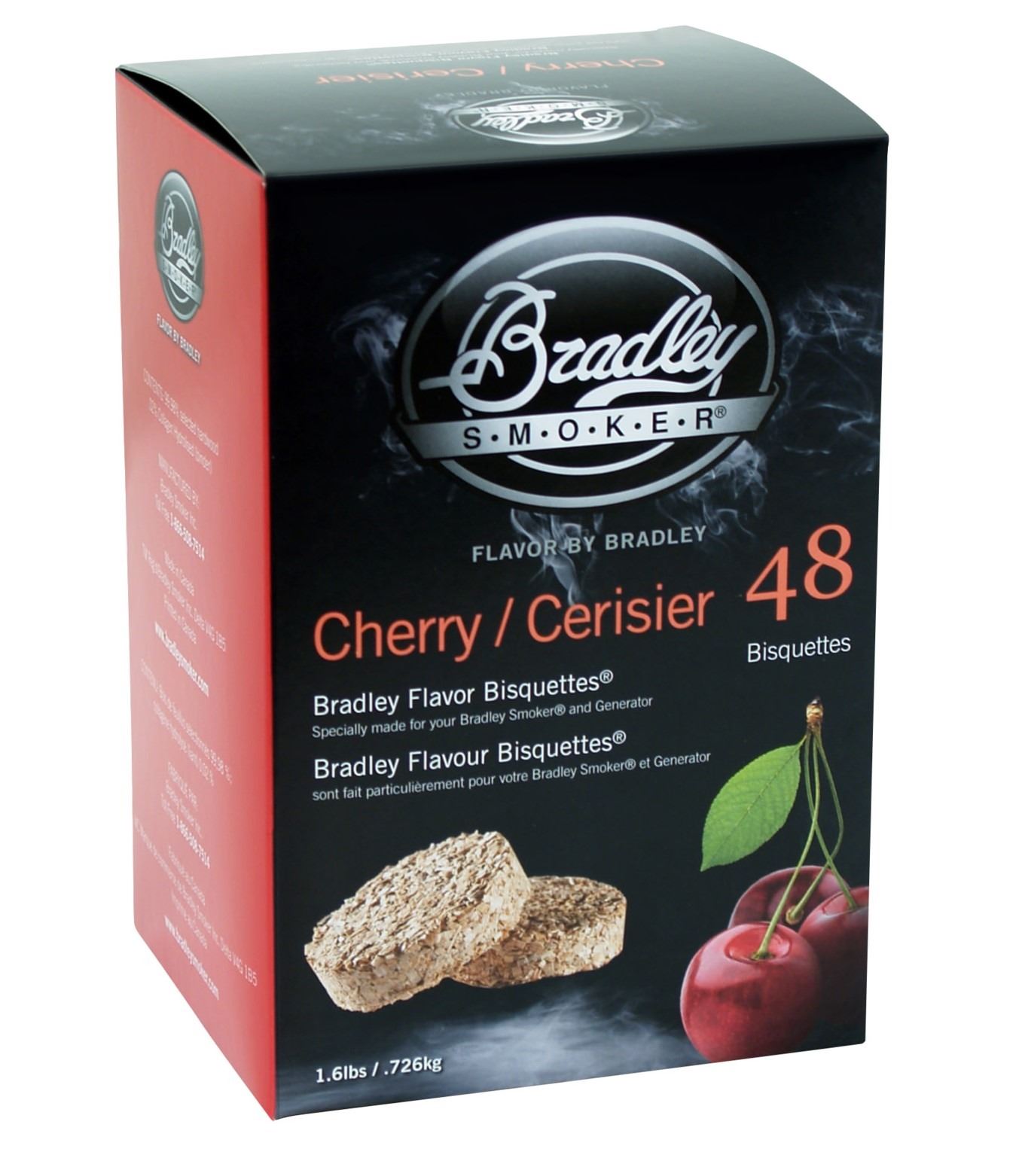 Cherry Bisquettes provide a mild, sweet, and fruity aroma perfect for smoking poultry, fish, seafood, beef, pork, lamb, water fowl, vegetables, and cheese.
