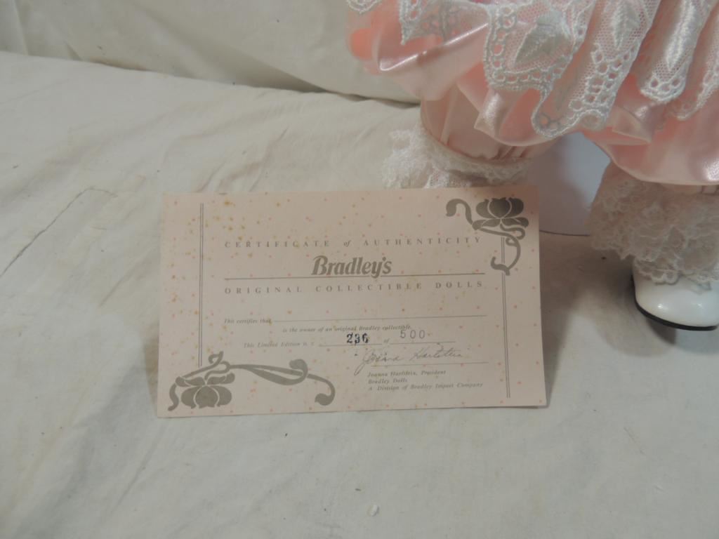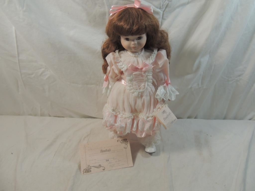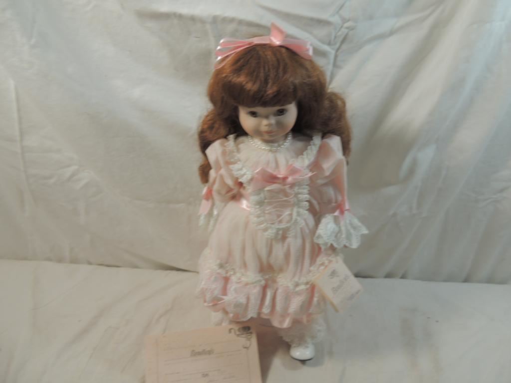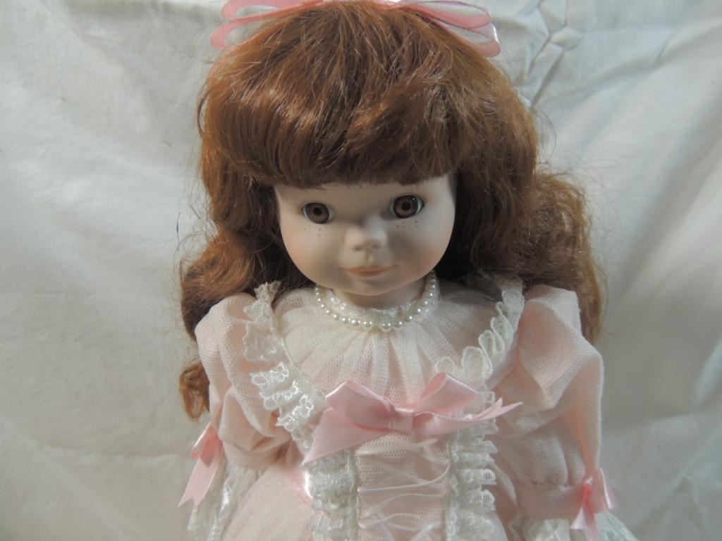 COLLECTIBLE DOLL, PINK DRESS SATIN AND LACE TINA DOLL, ON STNAD, PEARLS, RED HAIR, VINTAGE DOLL, COLLECTILBE DOLL AS SHOWN SEE PHOTO FOR MORE DETAILS.