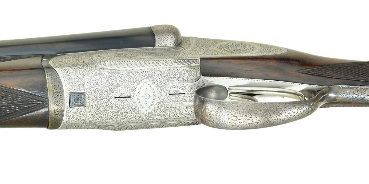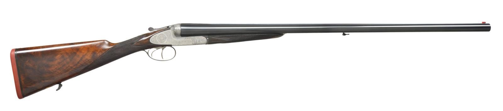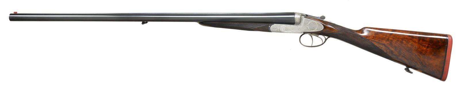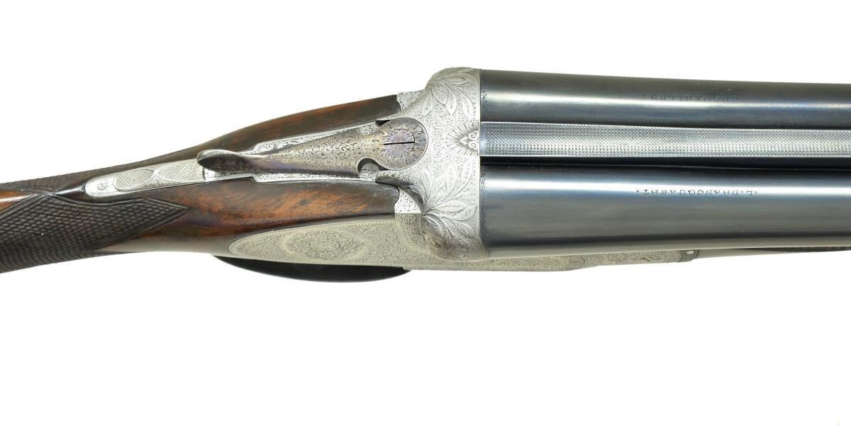 GUN WITH PURDEY STYLE SELF OPENING ACTION. Cal. 12 ga. 2 3/4". S# 2897. The 28 1/2" well struck dovetailed bbls. with slightly raised matted game rib are engraved "L. Brancquaert" "Bruxelles" on tops. Bbl. flats are stamped with pre-1926 Belgian Nitro proofs for 2 3/4" chambers. Serial number is on bottom of rear lump. Coin finished round bodied action with ornamental sideplates is fitted with Purdey type cocking cams at front. Water table is stamped "A.G.D. Patent" (A. G. Deforney). Action also features nonautomatic safety, Purdey type third fastener, sideclips and double triggers. Maker's name and address are on floorplate. Action is engraved with near full coverage varying size but mostly medium, well cut scroll surrounding rose bouquets within small scroll, feather, and geometric borders. Fences are semi-relief engraved with laurel leaves. Blued trigger guard with matching scroll on bow has serial number on tang. Straight grip buttstock of very nicely figured and lightly marbled European walnut measures 14 1/2" over "Silver" type pad. Point pattern checkering is at grip. and a vacant gold oval and a sling loop matching that screwed to bottom rib, are on toeline. Matching splinter ejector forend has Anson release. MEASUREMENTS: BBLS: Bore Diameter: R .720", L .720". Restriction: R .026" (MOD), L .037" (FULL). Min. Wall Thickness: R .029", L .030". STOCK: DAH: 2 3/8". DAC: 1 1/2". LOP: 14 1/2". CAST: 5/8" off. WEIGHT: 6 lb. 13 oz. CONDITION: good as refinished. Bbls. retaining nearly all of a good quality reblue over marks and light scratches. Action is cleaned to coin finish. Engraving is very slightly softened. Top lever has been heat blued and is mostly light purple to blue. Trigger guard has had the same treatment. Stocks retain nearly all of a glossy oil refinish, checkering competently recut. Bores are bright and shiny with no evident problems. Action is tight. Bbls. are on face. Ejectors are strong and in time. Louis Brancquaert was known for providing only the finest made guns soured from Belgian's best makers to his clientele. (22-4478/MGM). CURIO. $3,000-5,500.