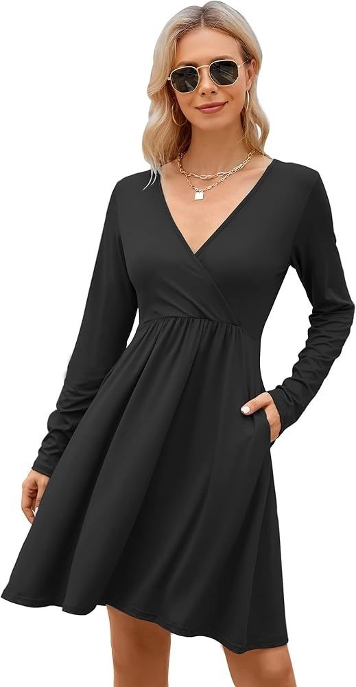V NECK PLEATED LOOSE SWING CASUAL DRESS, AMZ SES