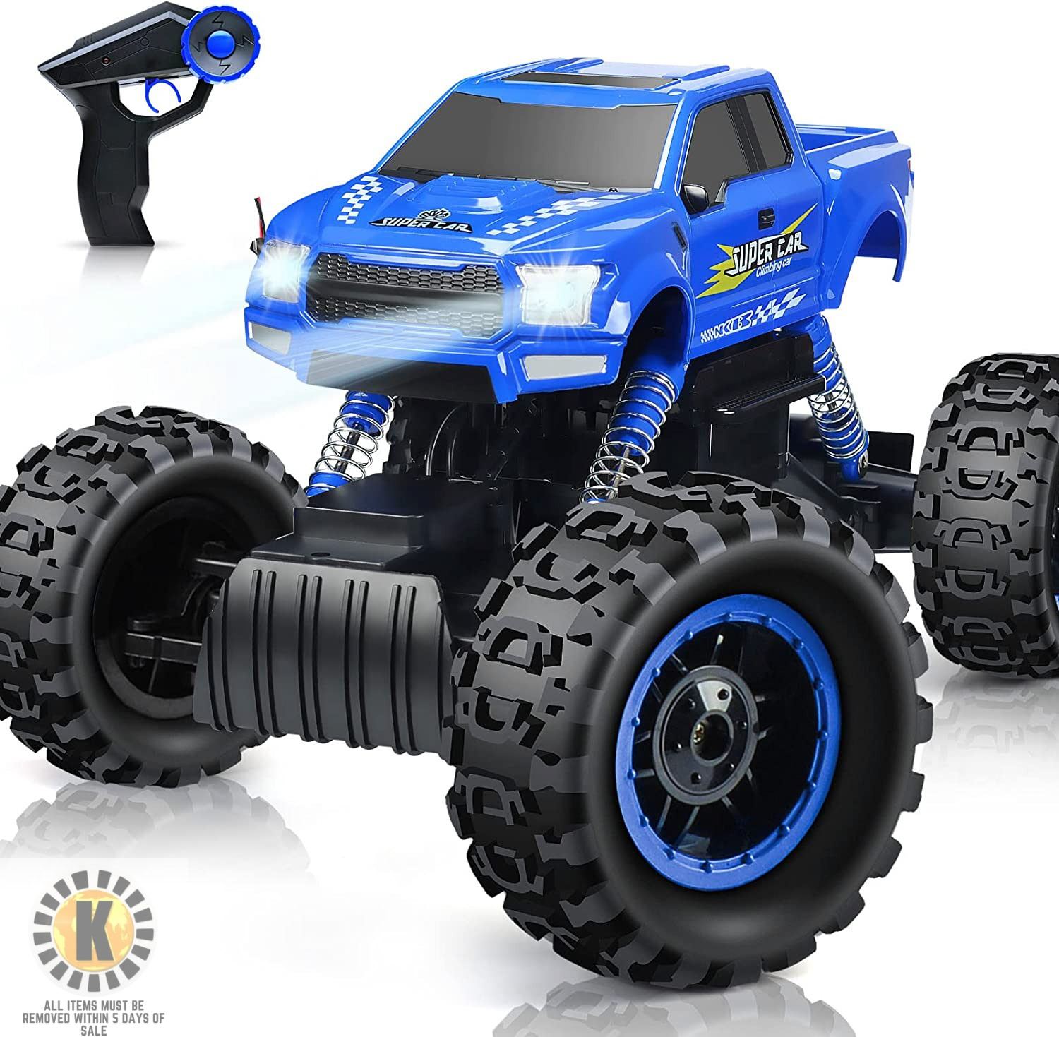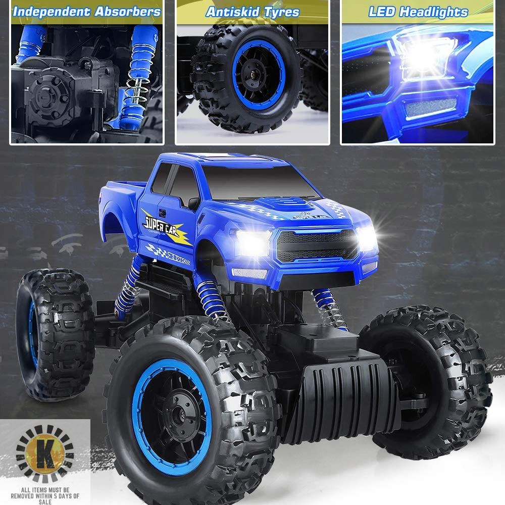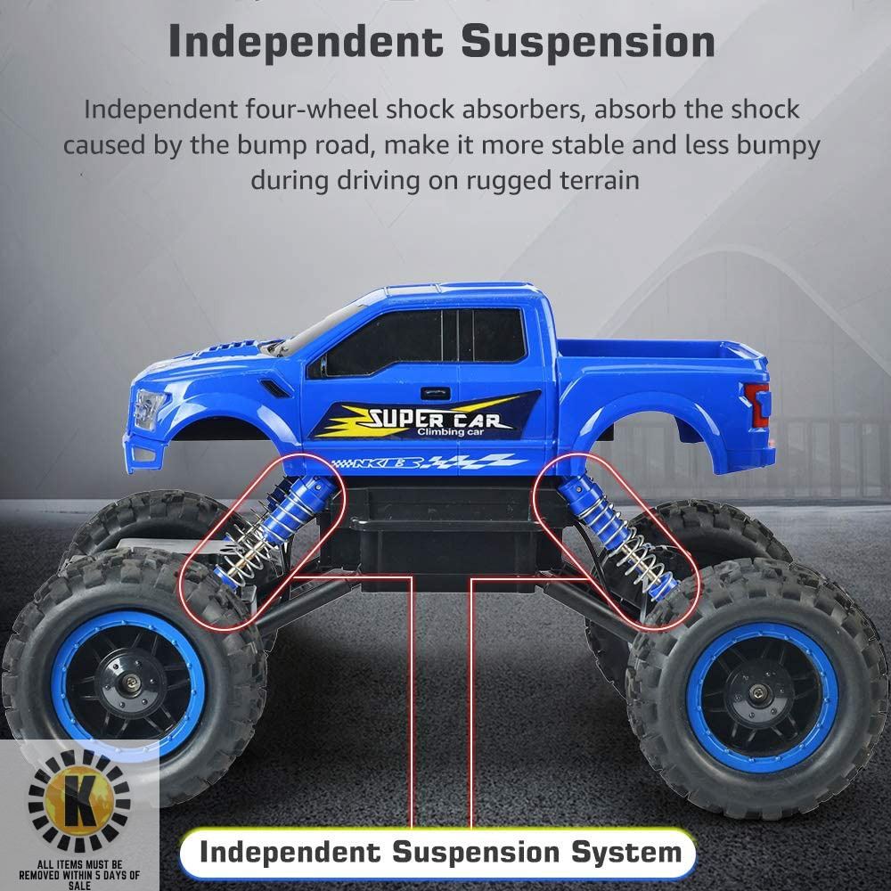 MONSTER TRUCK DESIGN WITH 4 INDEPENDANT SHOCKS, RECHARGEABLE BATTERY PACK, HIGH SPEED AND HIGH POWER MOTOR, LED HEADLIGHTS AND ROCK CRAWLER CAPABLE, SEALED PARTS, IN ORIGINAL BOX, MANUAL INCLUDED, AMZ SES. ALL ITEMS MUST BE REMOVED WITHIN 5 DAYS OF SALE