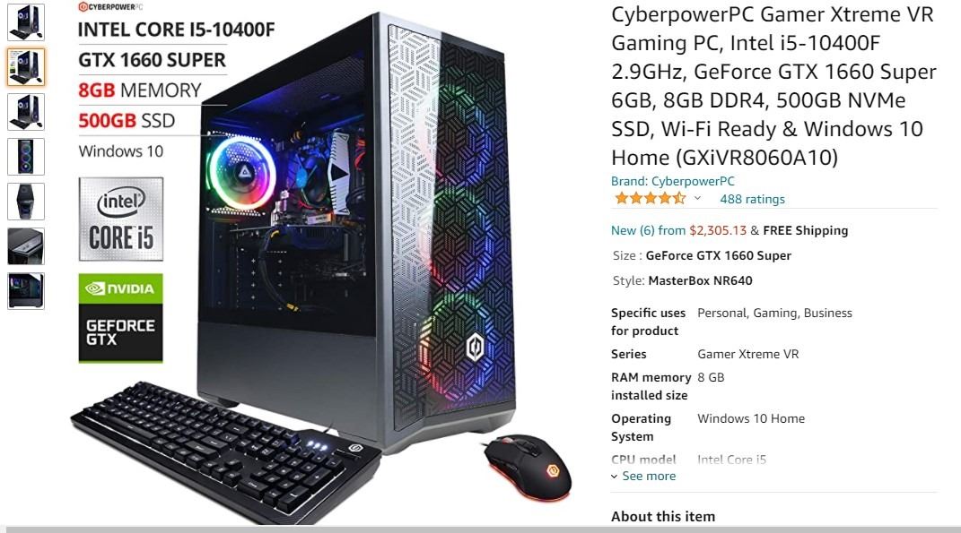 XTREME VR GAMING PC, INTEL I5-10400F 2.9GHZ, GE FORCE GTX 1660 SUPER 6GB, 8GB DDR4, 500GB NVME SSD, WIFI READY AND WINDOWS 10 HOME, MODEL: GXIVR8060A10, COMES WITH KEYBOARD AND MOUSE, DRIVERS AND UTILITIES, MANUALS AND GUIDES, ALL PARTS CONFIRMED, TESTED, AMZ SES