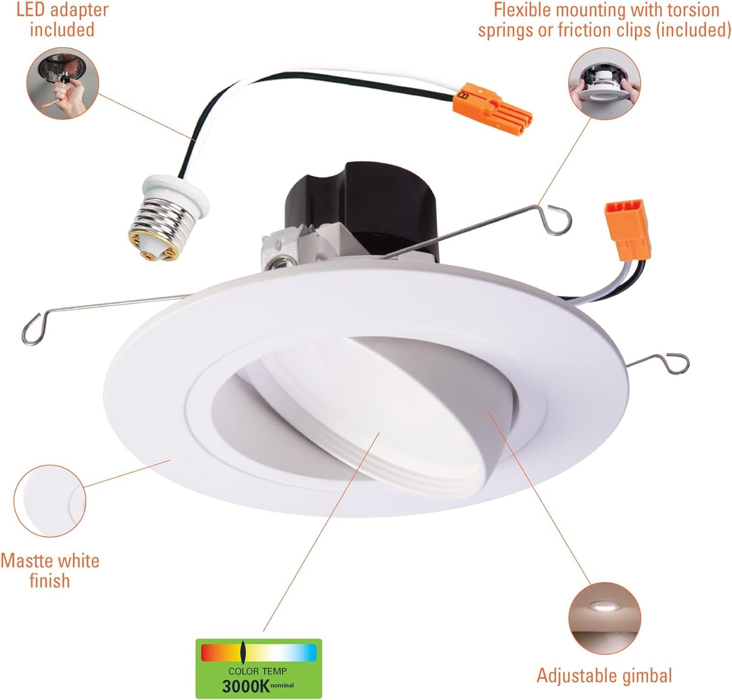 LED BULB & TRIM REPLACEMENT. 35 DEGREE TILT, 360 DEGREE ROTATION. SUITABLE FOR CEILINGS UP TO 9 FEET HIGH. 5 SELECTABLELIGHT COLOUR 3000K, 653 LUMENS, 7.2 WATTS. MSRP $50 AMZ SES