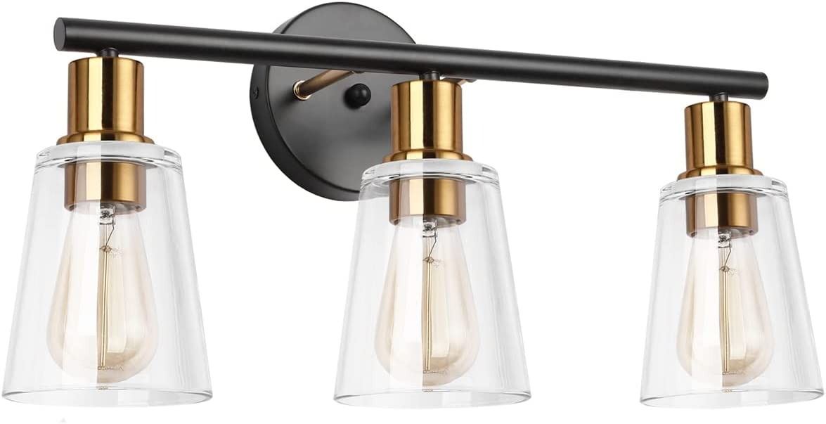 MATTE BLACK AND BRASS FINISH, 3 CLEAR GLASS SHADES, MULTI PURPOSE, SEALED PARTS, MANUAL AND ALL HARDWARE CONFIRMED, DIRECT WIRING REQUIRED, AMZ SES, MSRP. $139.99ALL ITEMS MUST BE REMOVED WITHIN 5 DAYS OF SALE